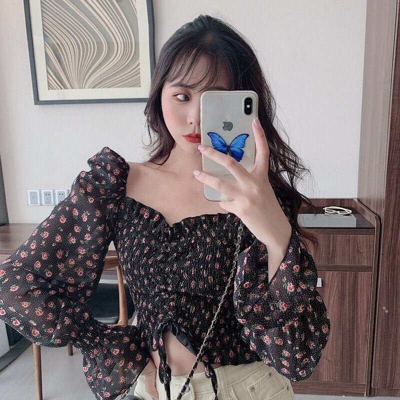 夏服韓国ファッションフローラルシフォンシャツ 長袖スリーブギャザートップス ロング 夏物 花柄 パープル スタイル YY8524495