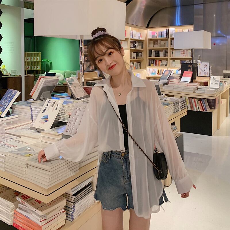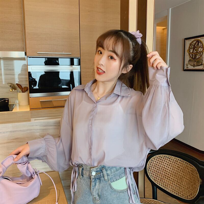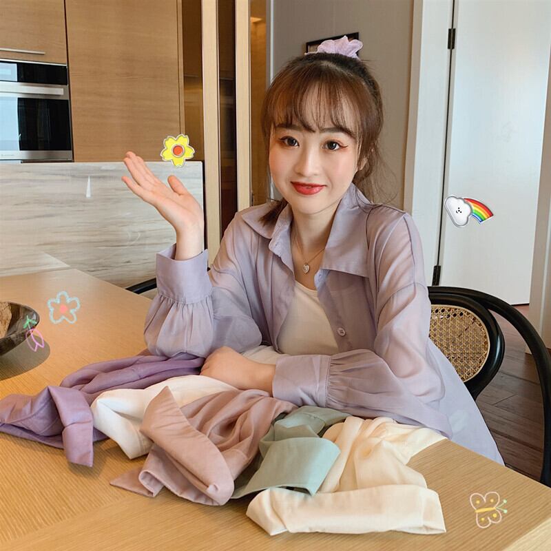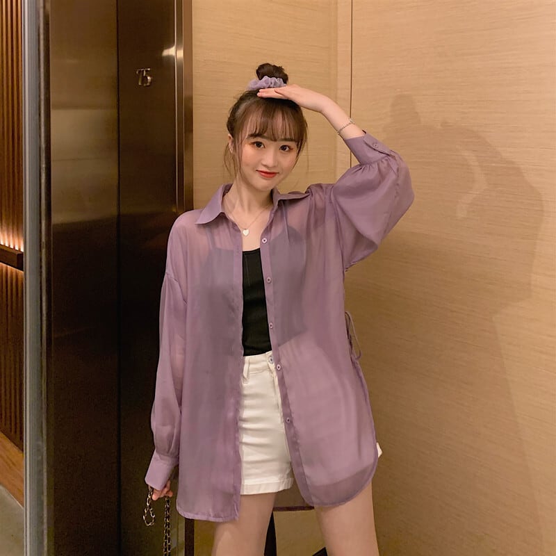 シャツレディース薄手シースルー透け感パステルカラー夏服韓国ファッションルーズ襟シャツ夏物 パープル ミドル丈 YY0163680