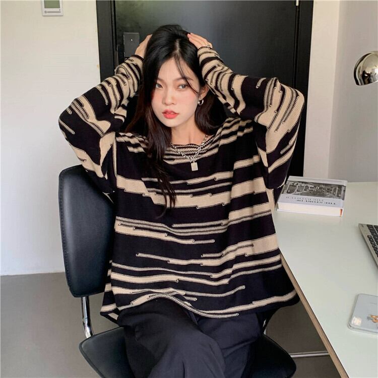 スタンダードストライプニットプルオーバー セーター コート 秋物ルーズトップス レトロ オータム ミドル丈 MONROE37383564495