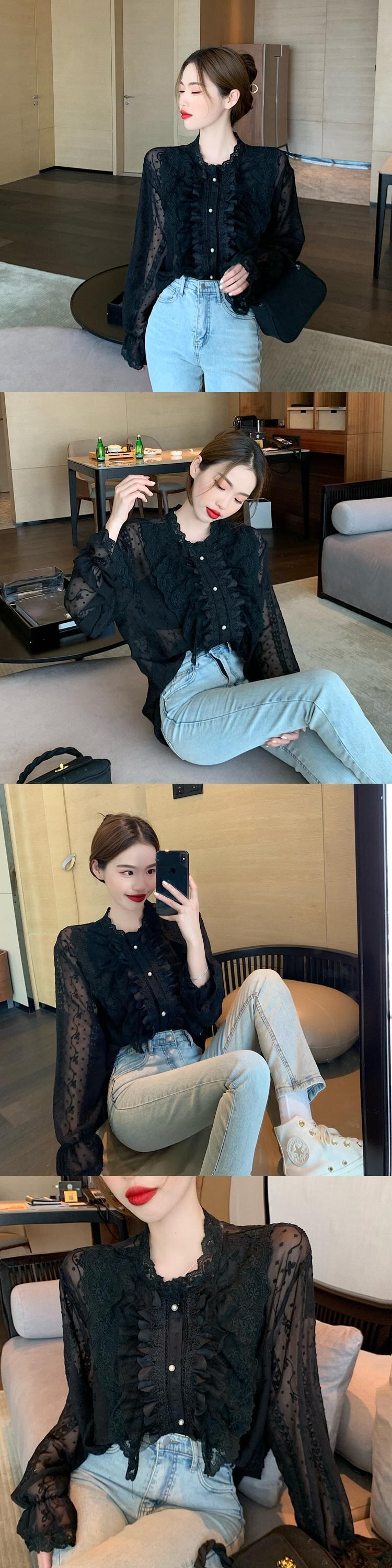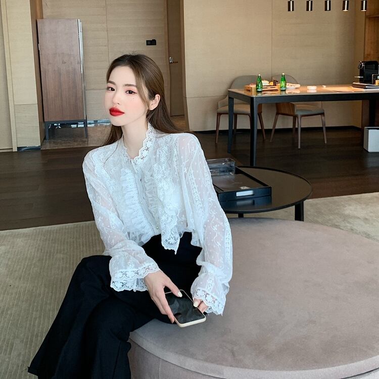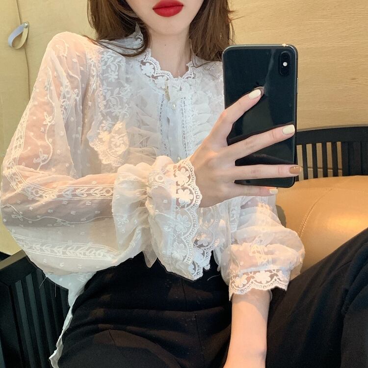 レースシャツ レディースルーズ韓国ファッションスタイルホワイトスプリング秋物トップス ロング 春物 オータム 長袖 YY76529921601