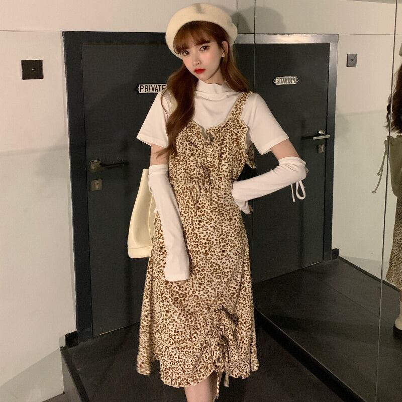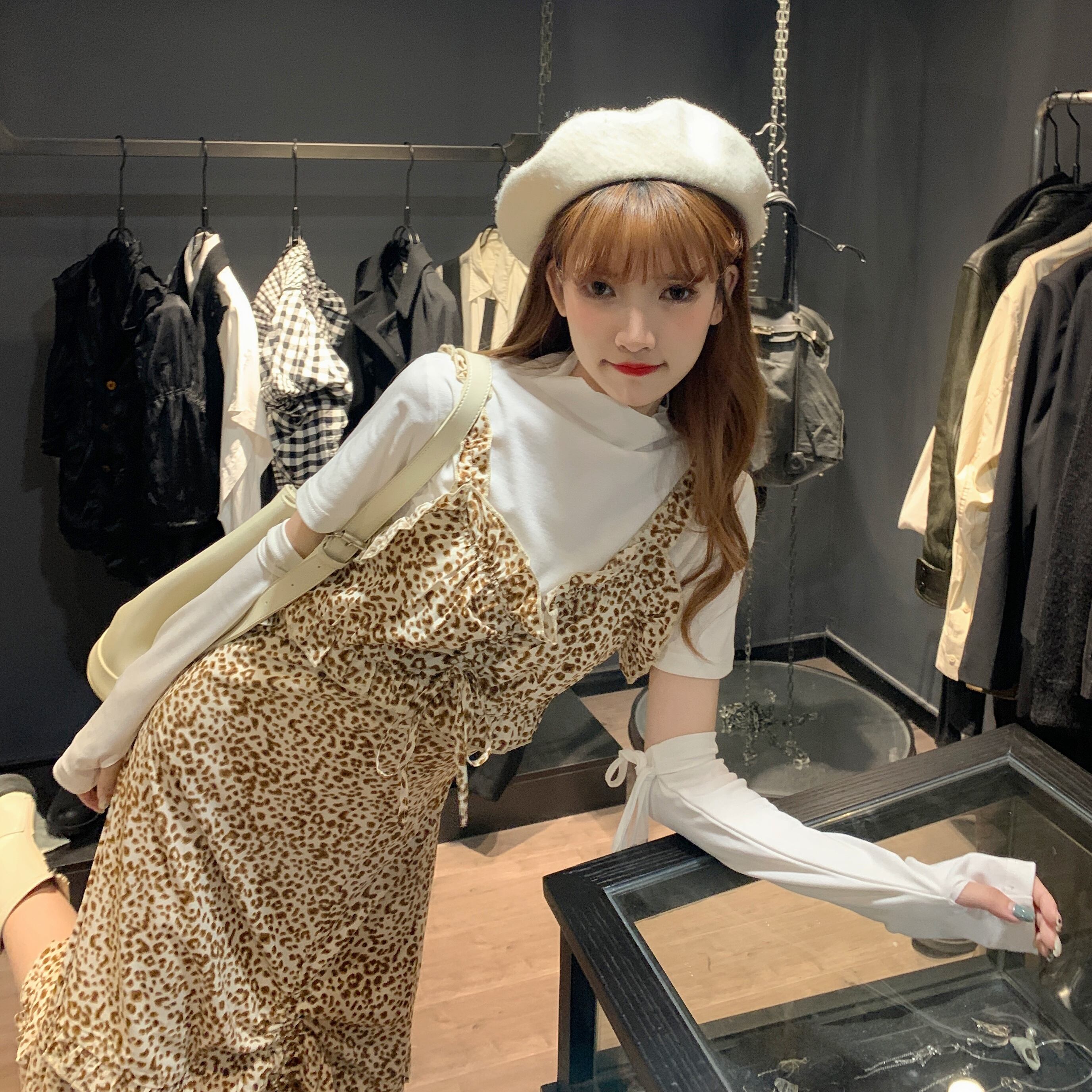 色:ヒョウ柄キャミソール,袖付きの白いTシャツ