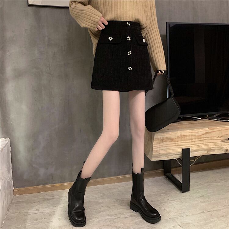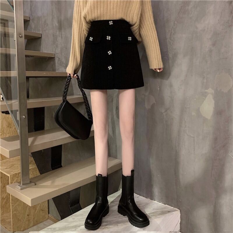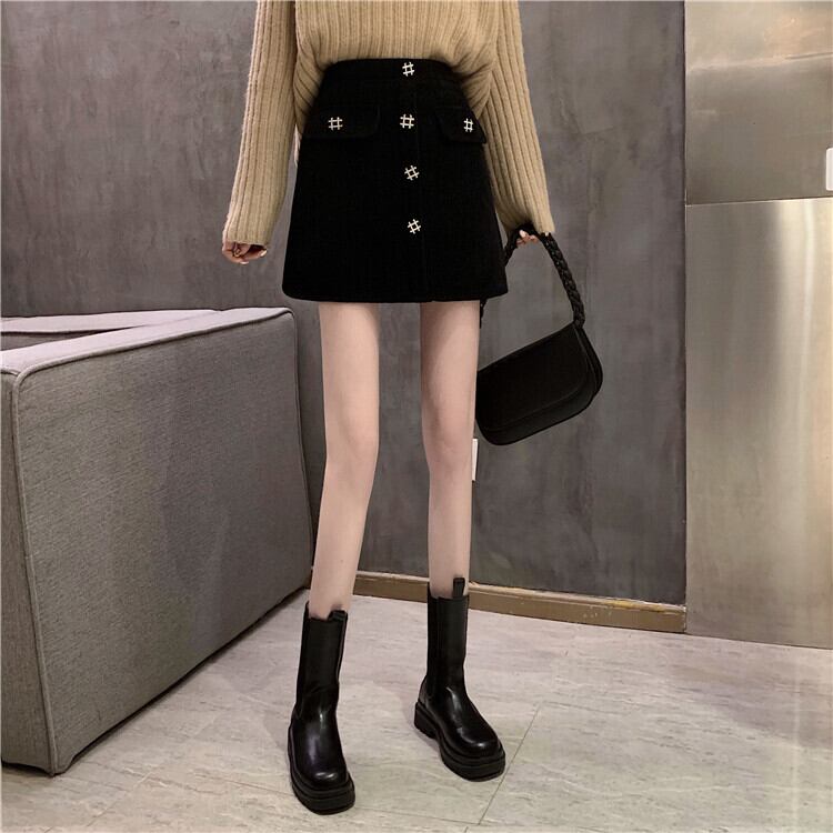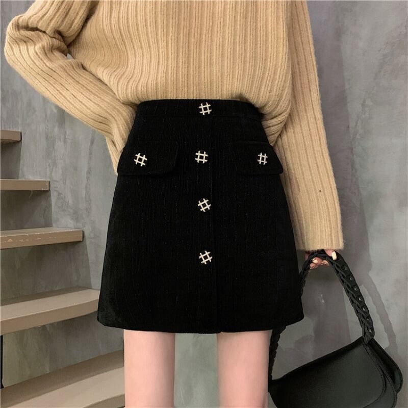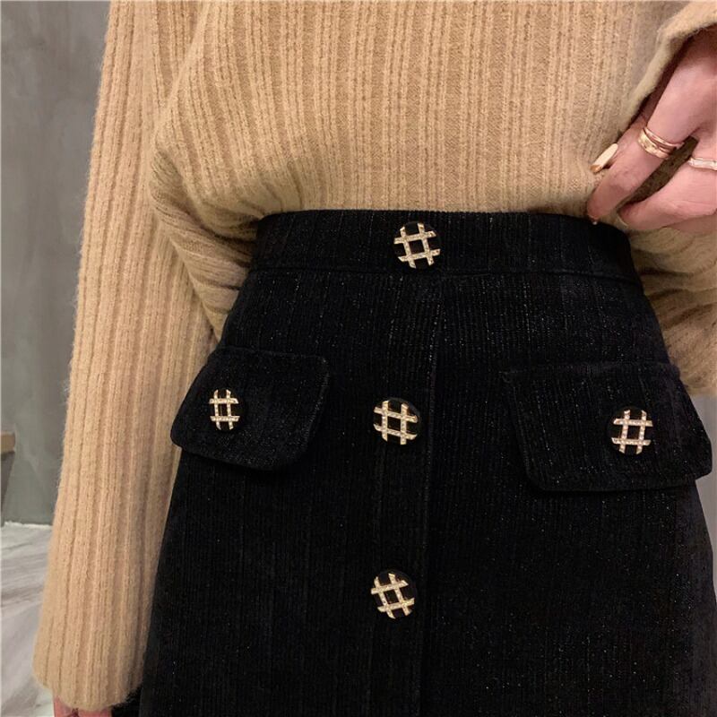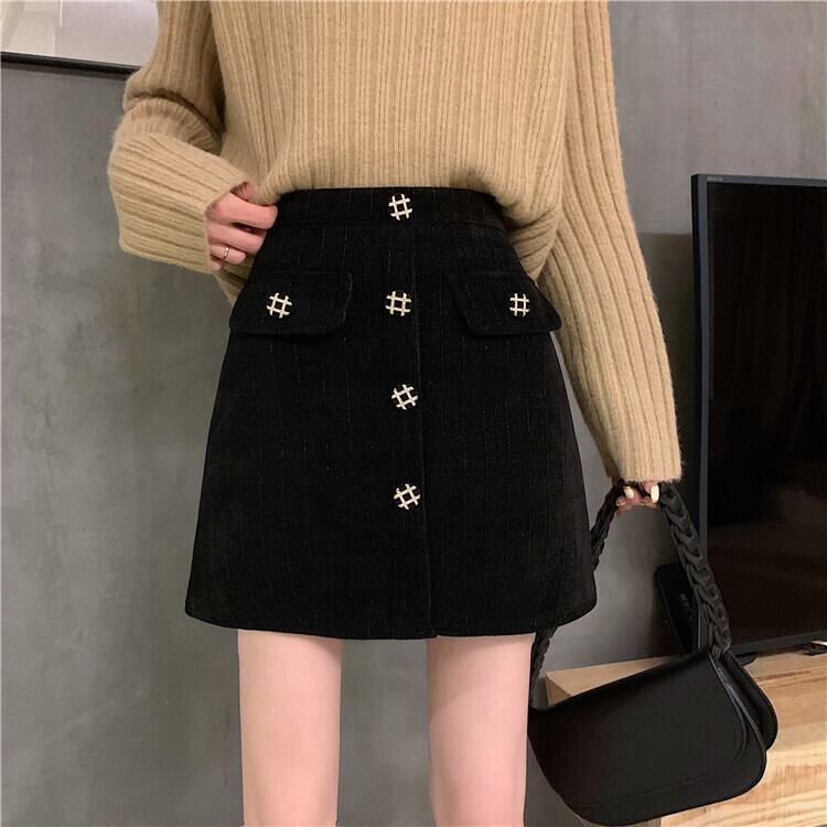 コーデュロイブラックショートスカート ハイウェストウェスト薄手Aライン秋物ウィンター韓国ファッション オータム 冬物 スタイル ウエスト YY58827497677