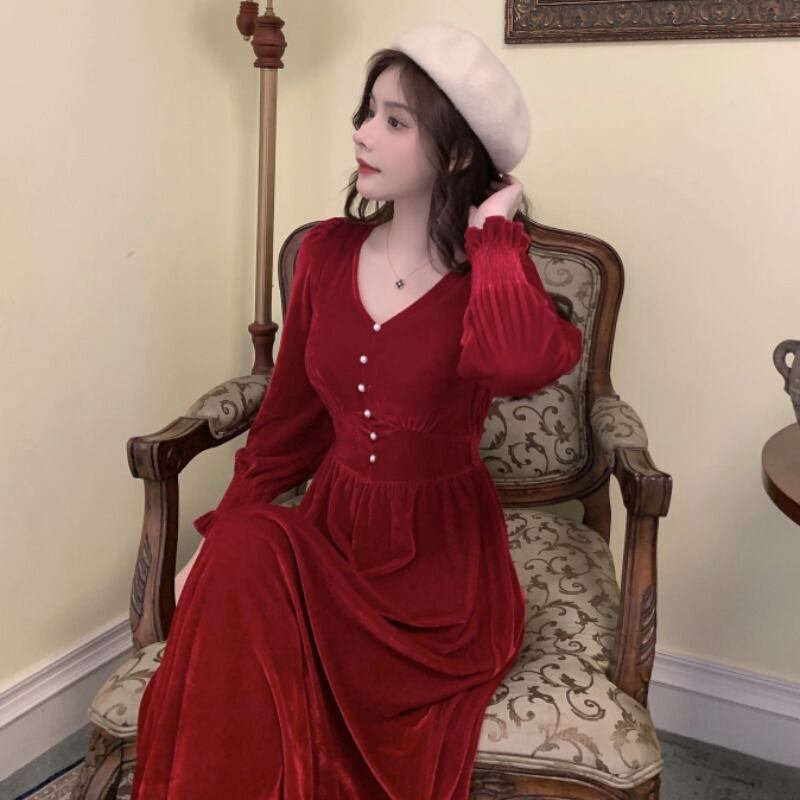 レッド厚みワンピーススタンダードスタイルAラインスカート レトロ YY63224439236