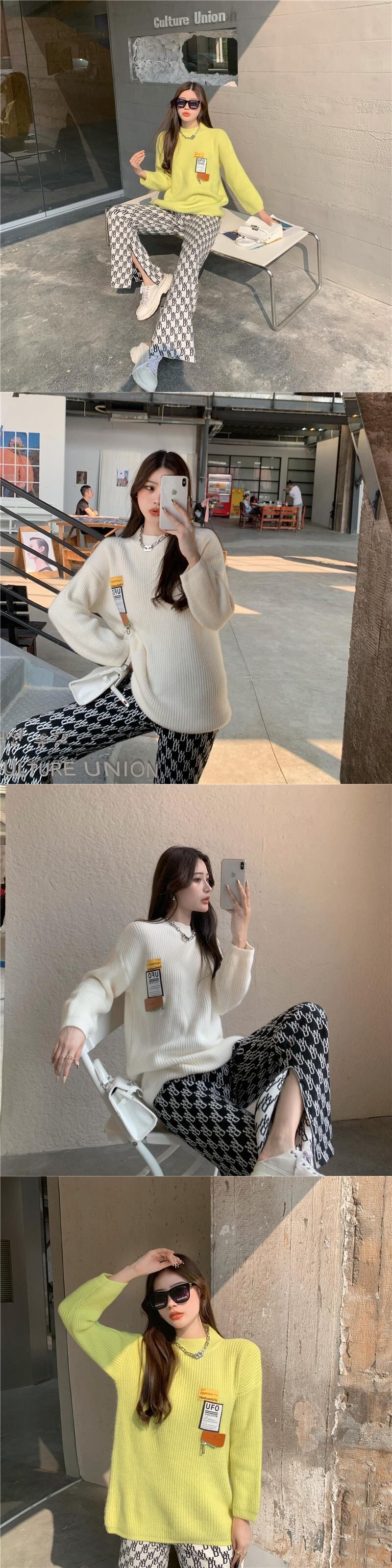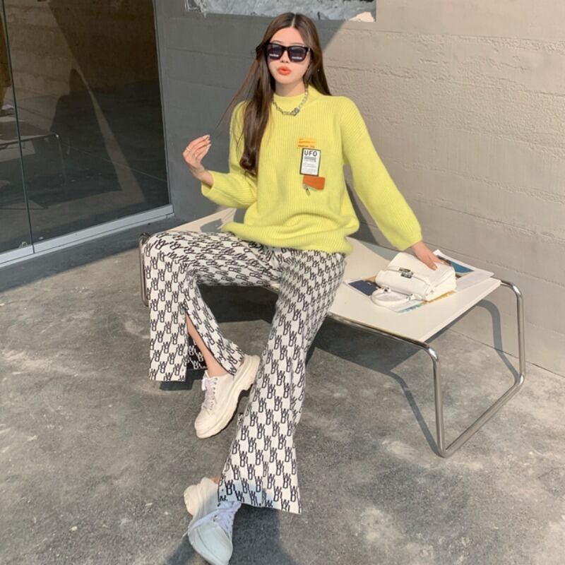 色:黄色いセーター,白いセーター,ホワイトフレアパンツ,ブラックベルボトム
