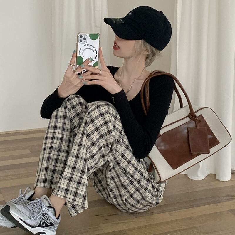 スタイルレディーススタンダードスプリング秋物スリムシャツ 格子柄カジュアルパンツ ロング レトロ 春物 オータム 長袖 ワンナンバー83329531063