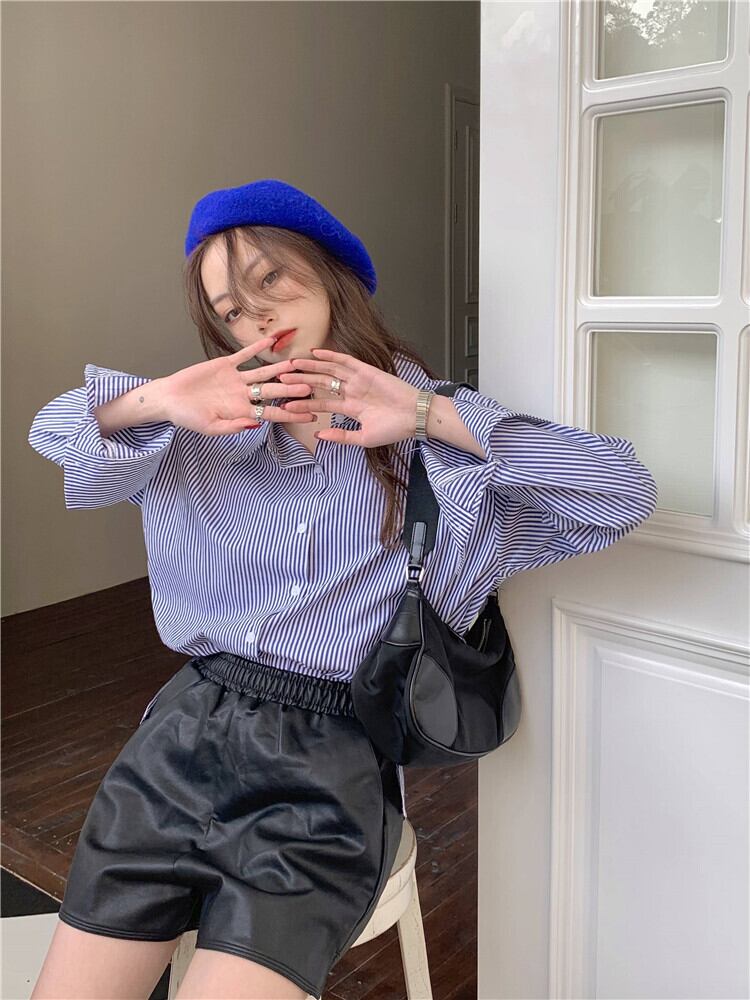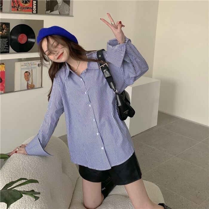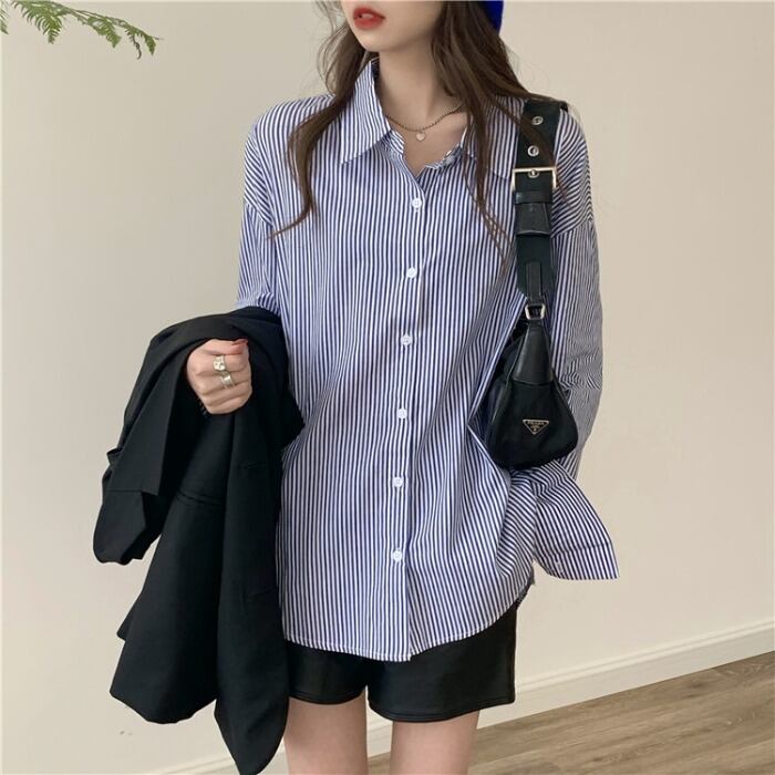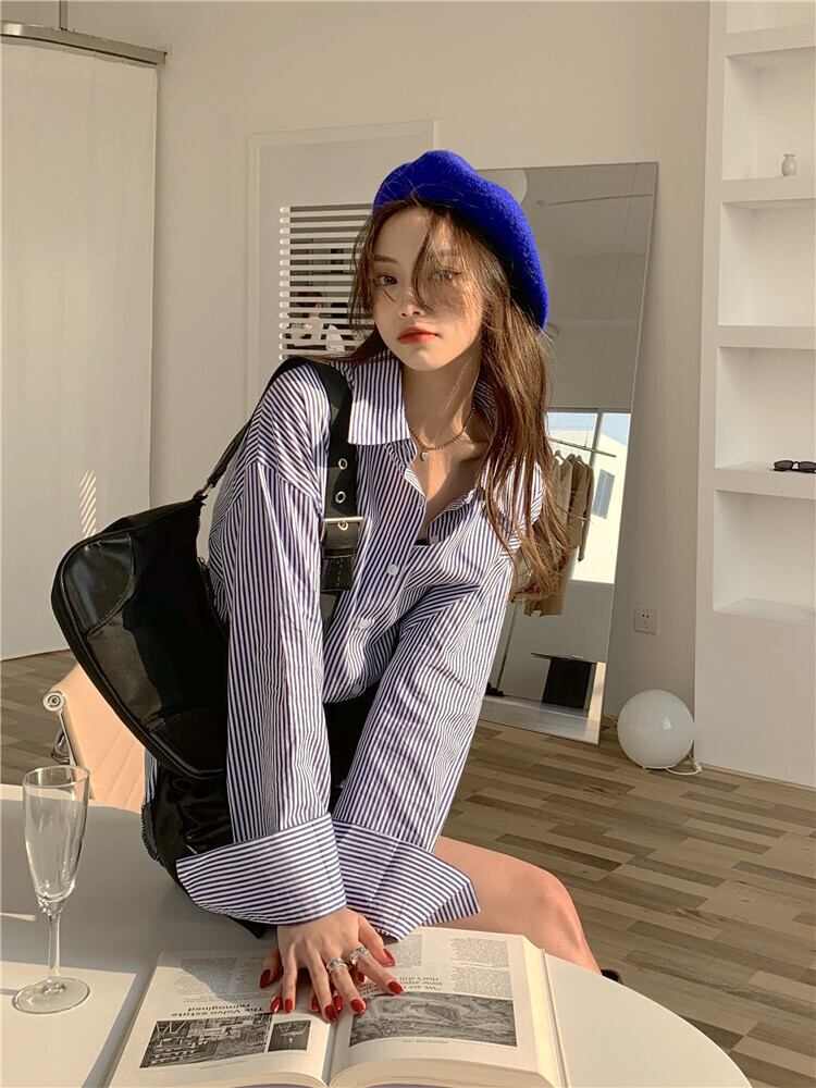 ストライプシャツ ジャケット レディースルーズ韓国ファッションスプリングトップス ロング 春物 スタイル 長袖 MONROE67107172113
