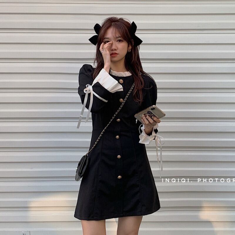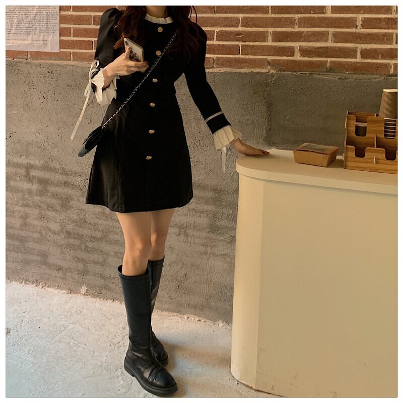 スプリング韓国ファッションウェストブラックワンピースホワイトカラーレディース ロング 春物 ステッチ 長袖 ウエスト YY22826320818