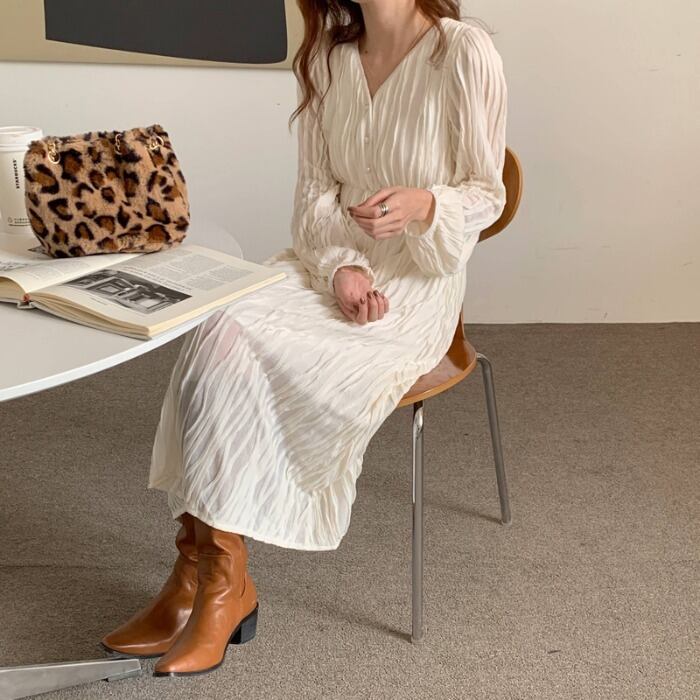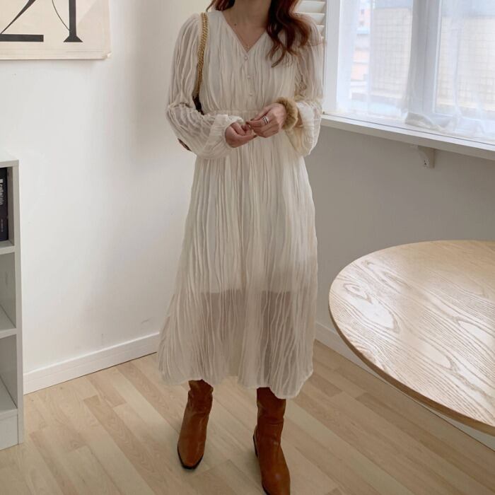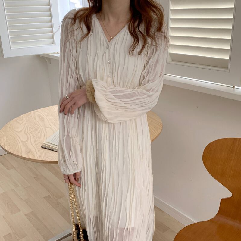 Vネックワンピースレディース韓国ファッションスタイルロングスカート スプリング 春物 長袖 ミドル丈 MONROE58890213504