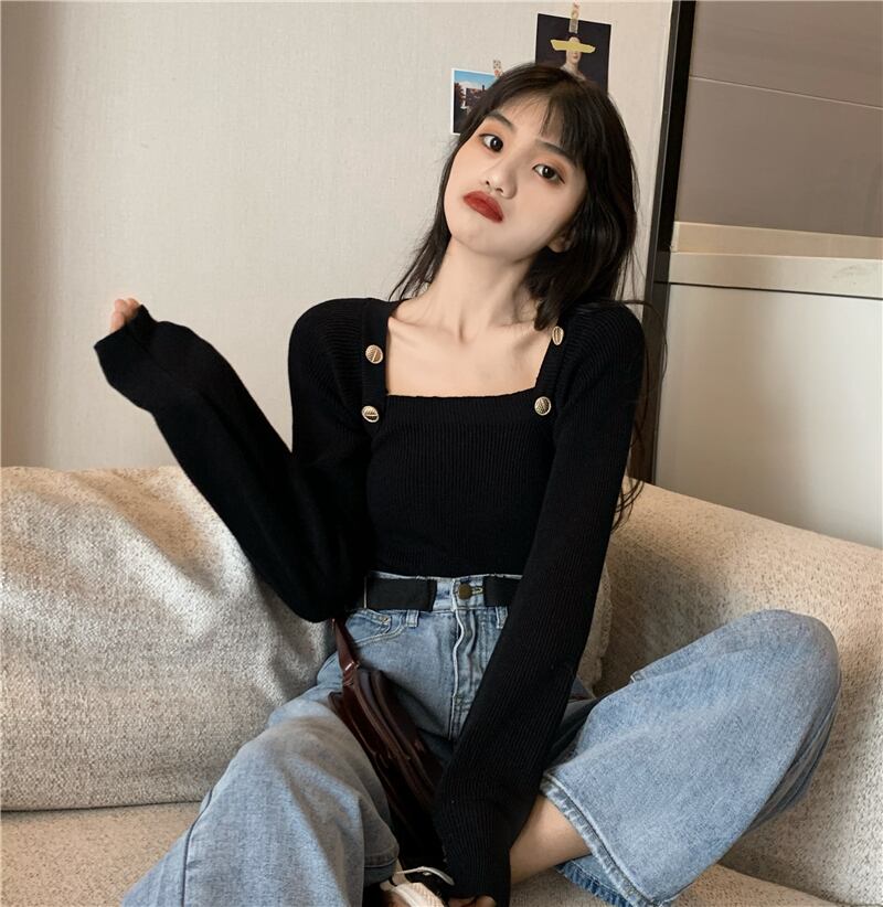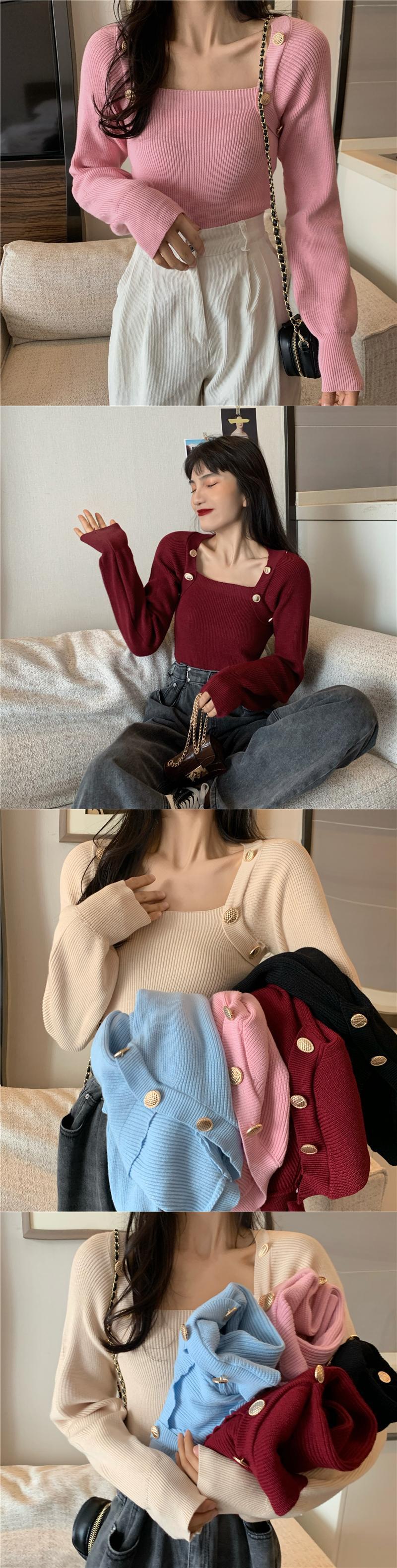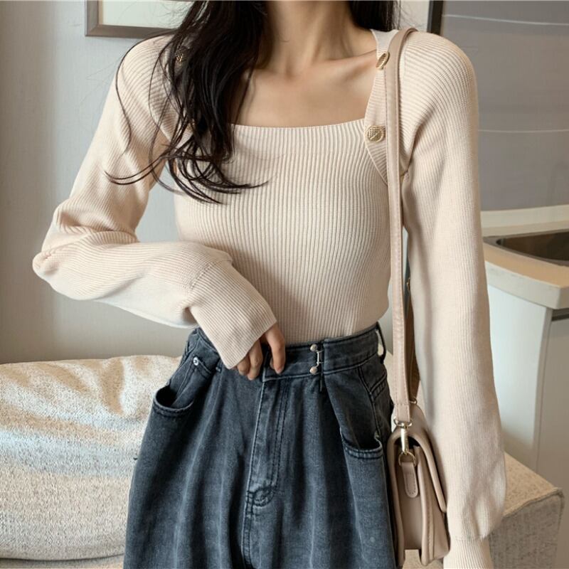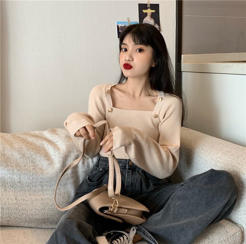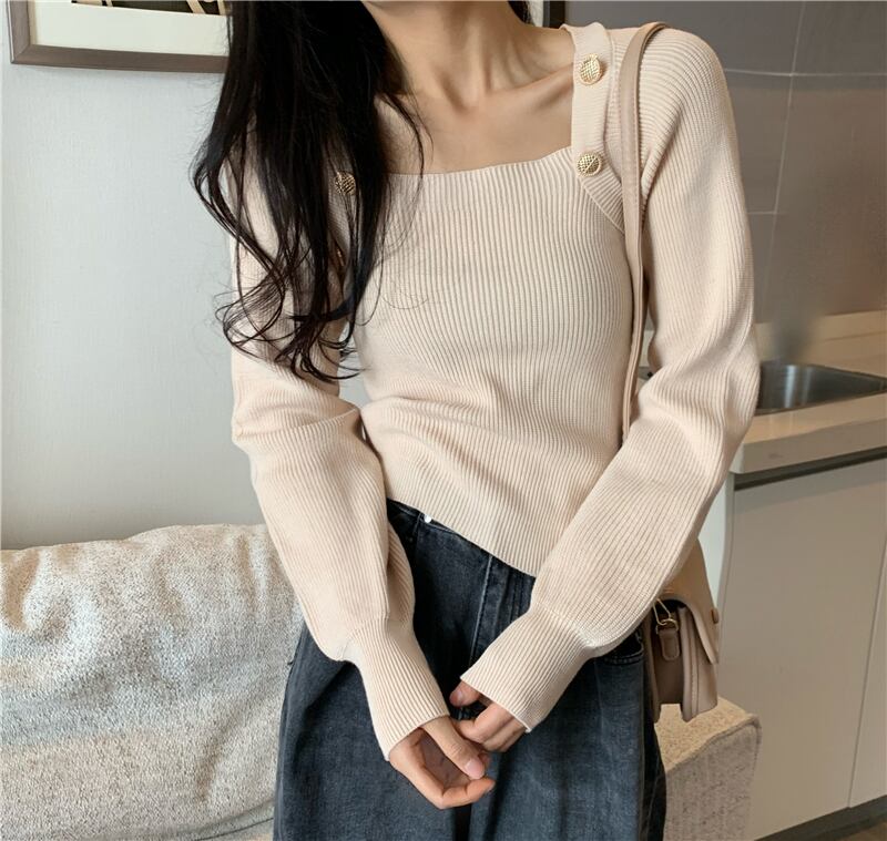 ソリッド カラーゆったりシャツ 秋物ウィンタースタイルニット長袖スリーブトップス ロング オータム 冬物 ソリッドカラー スクウェア YY2447381290