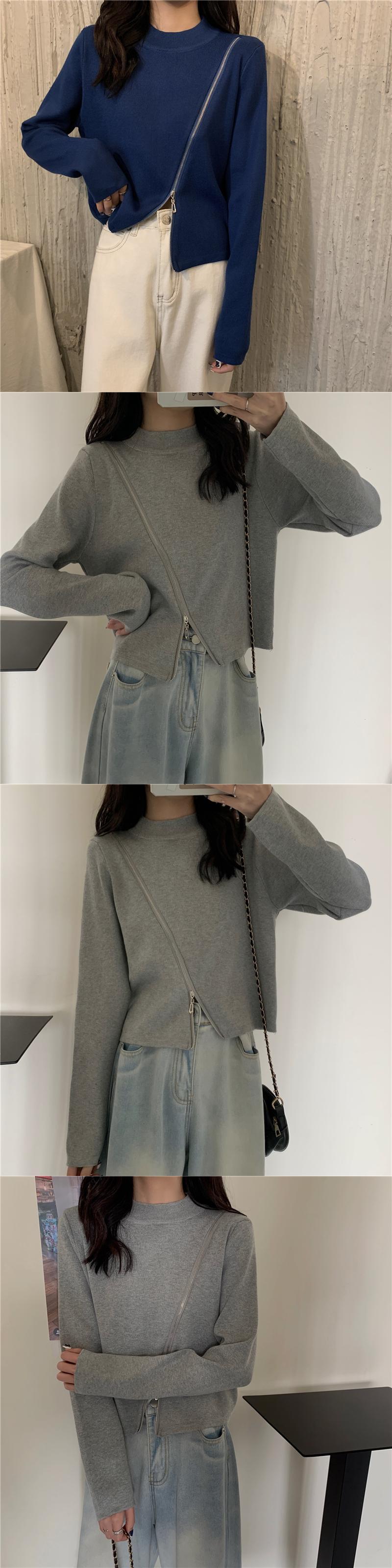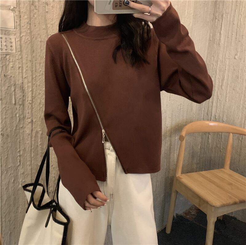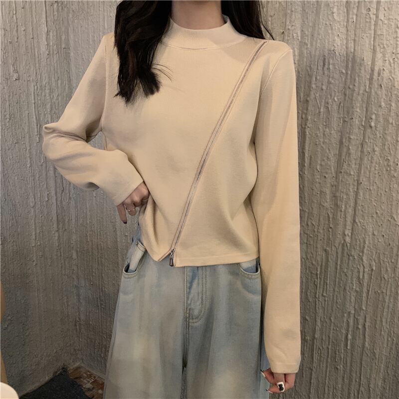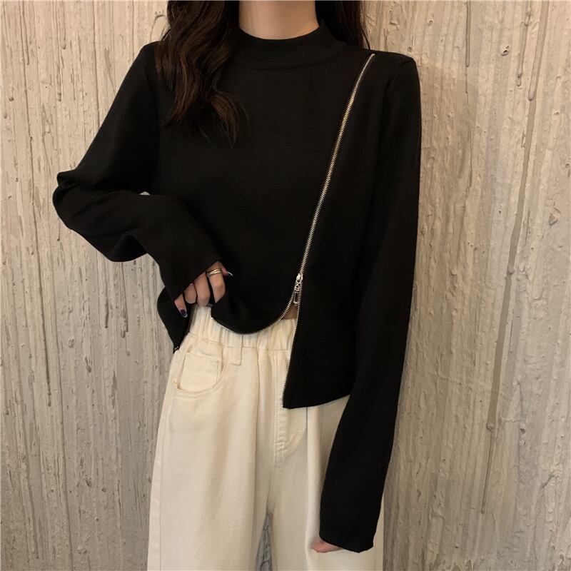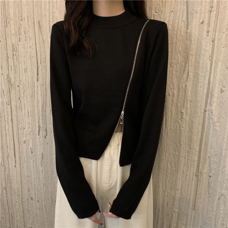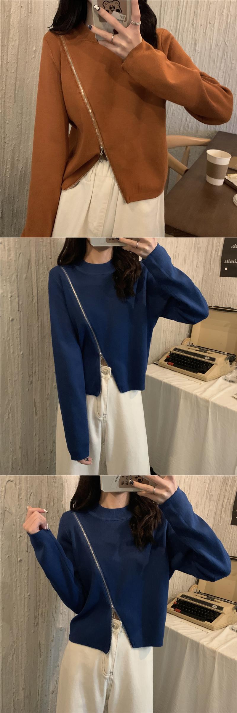 ラウンドネックジッパーセーター 韓国ファッションウィンターカラースリムショートゆったりトップス ロング 冬物 Oネック ピュア 長袖 YY48383986510
