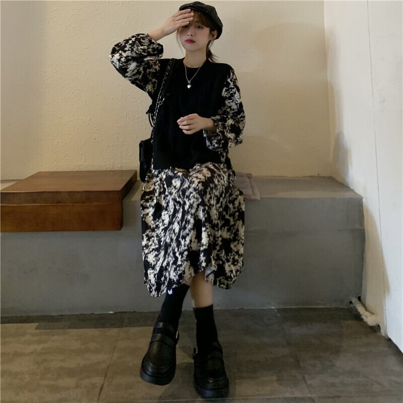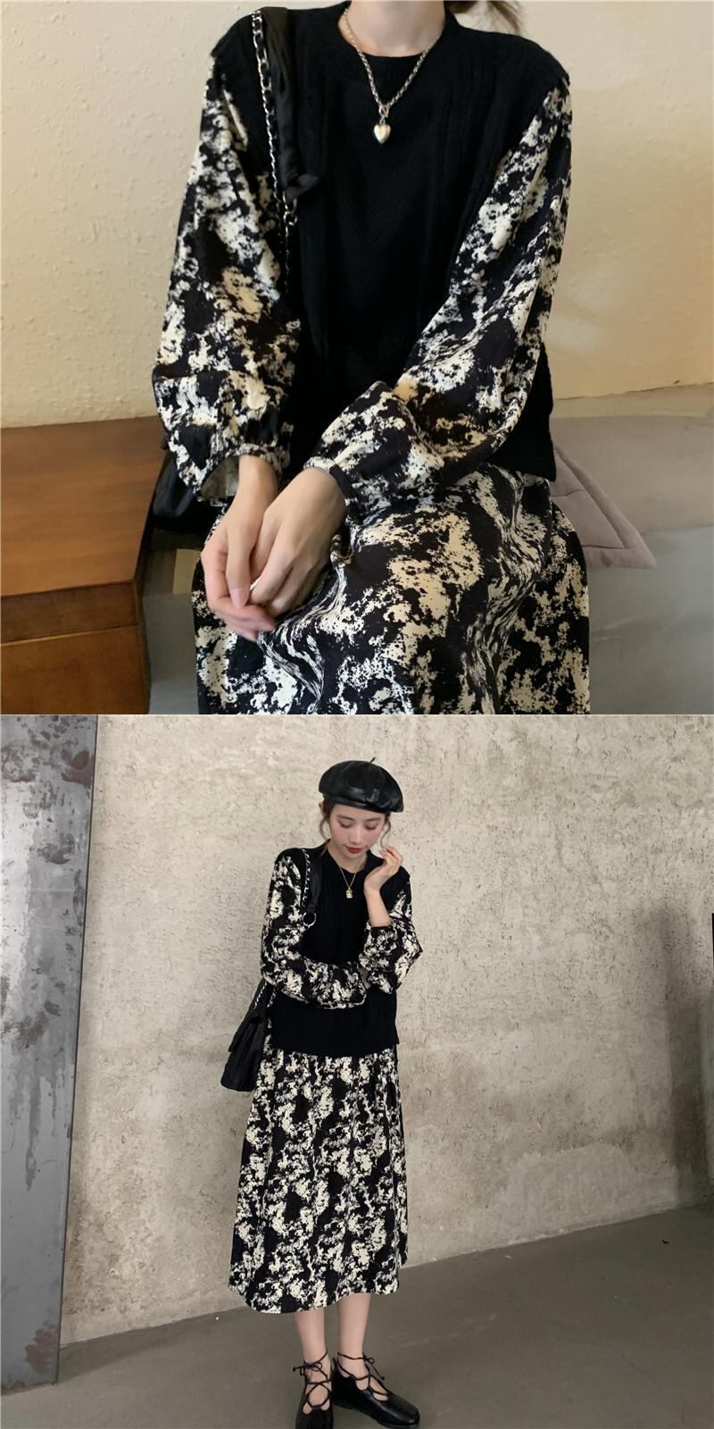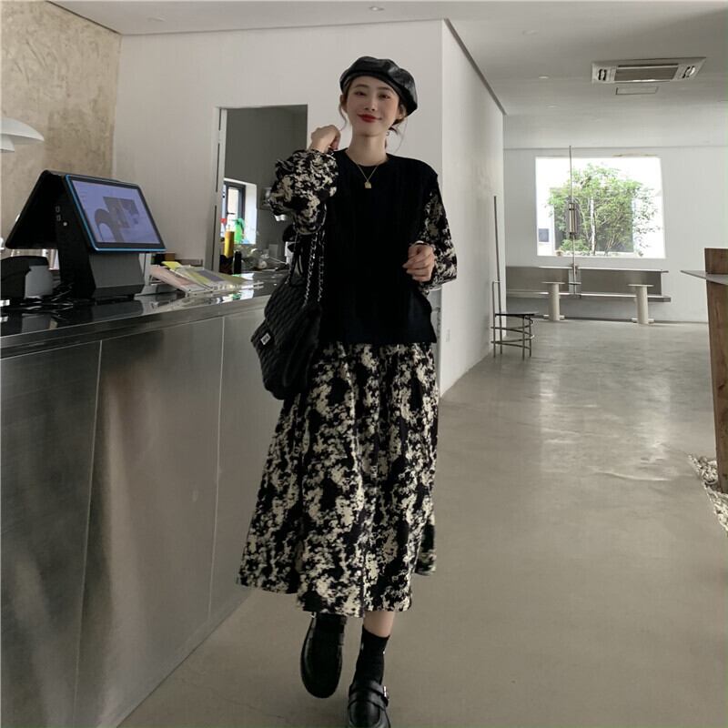 スタンダードブラックワンピーススプリングロングスカート Aライン レトロ 春物 ミドル丈 MONROE48425110893