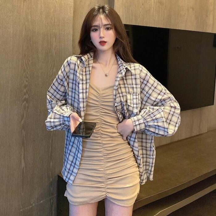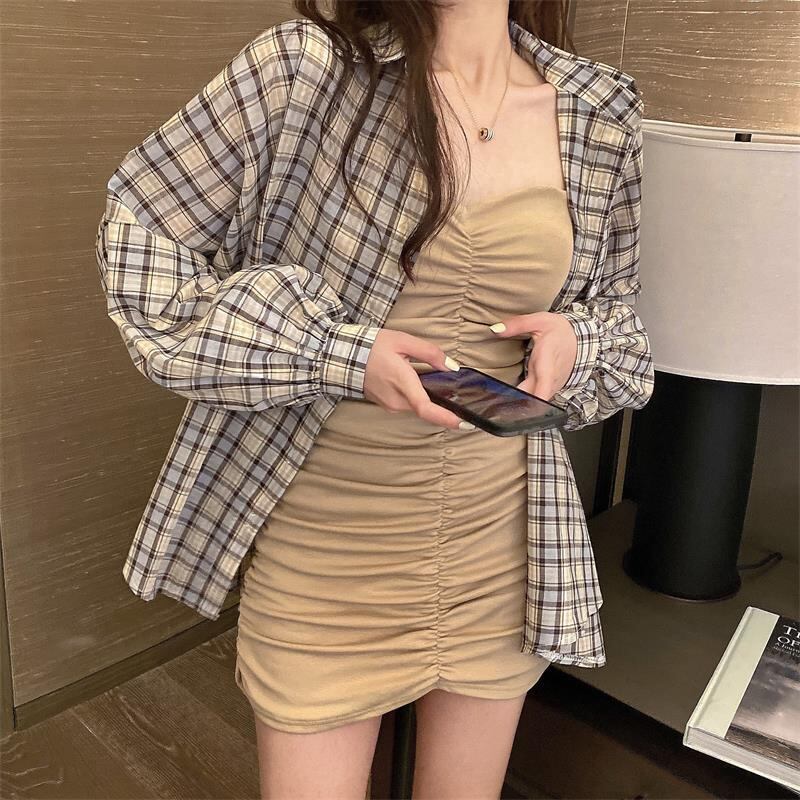 スプリング秋物プリーツスリムワンピース格子柄長袖スリーブシャツ ジャケット セット ロング 春物 オータム ワンナンバー17739802620