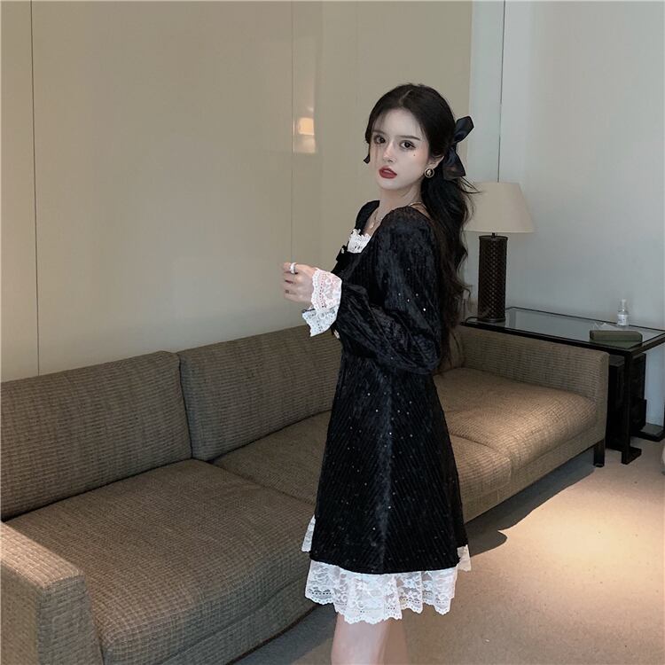 ワンピース秋物ウィンターウェストリボンブラックスカート レース長袖スリーブレディース ロング オータム 冬物 スクウェア ステッチ ウエスト YY1858754594