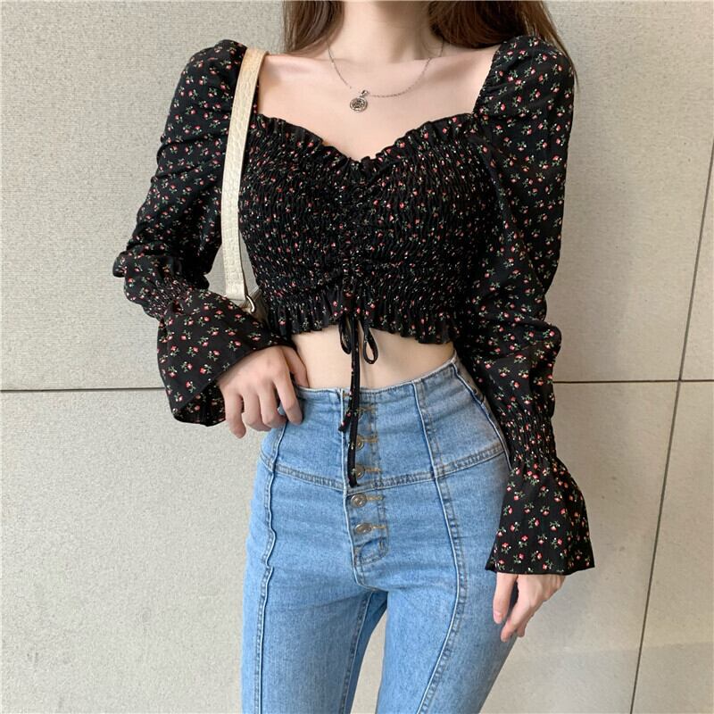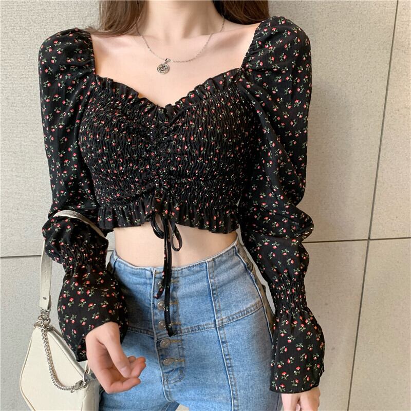 スタンダードフローラルシフォンシャツ レディースギャザー韓国ファッションショートクロップトップ トップス レトロ 花柄 スクウェア スタイル YY11339362934
