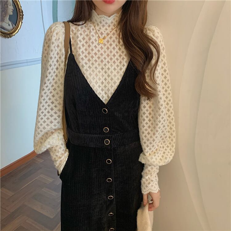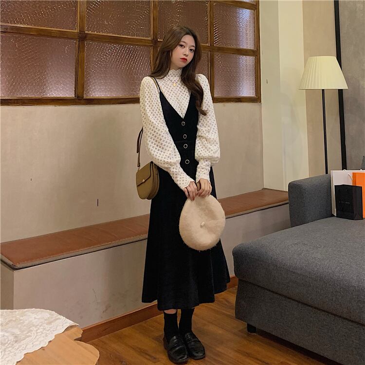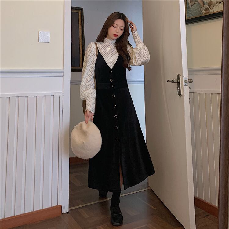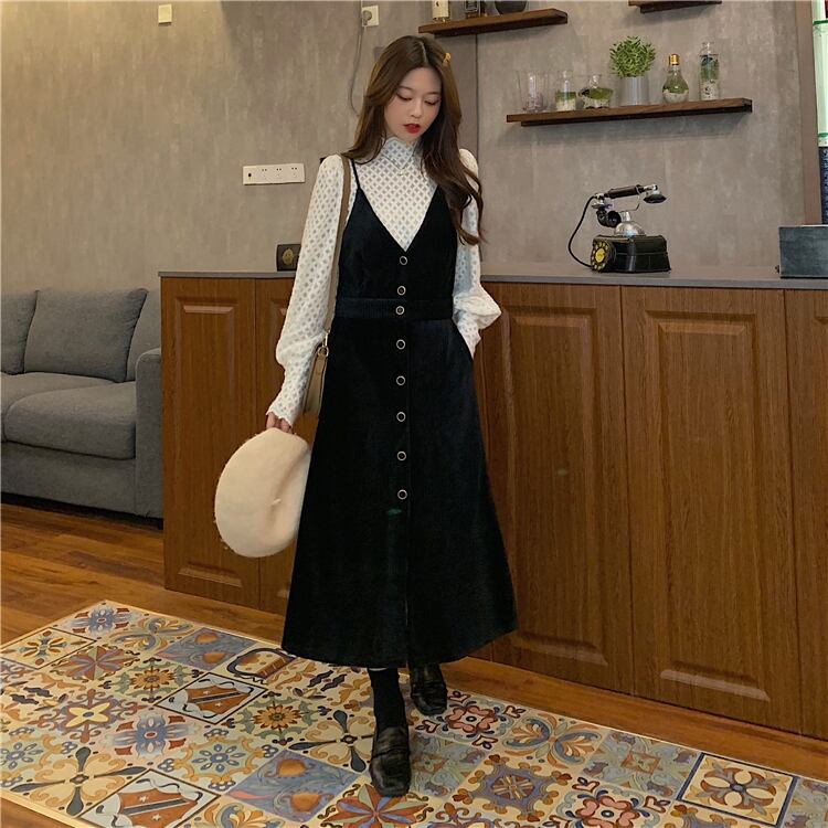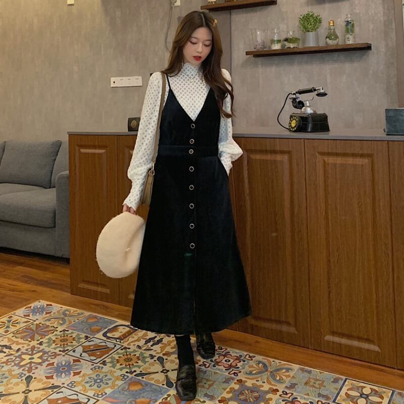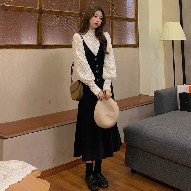 スタイルレディーススタンダード長袖スリーブゆったりシャツ Vネックブラックスカート ロング レトロ ワンナンバー45526246276