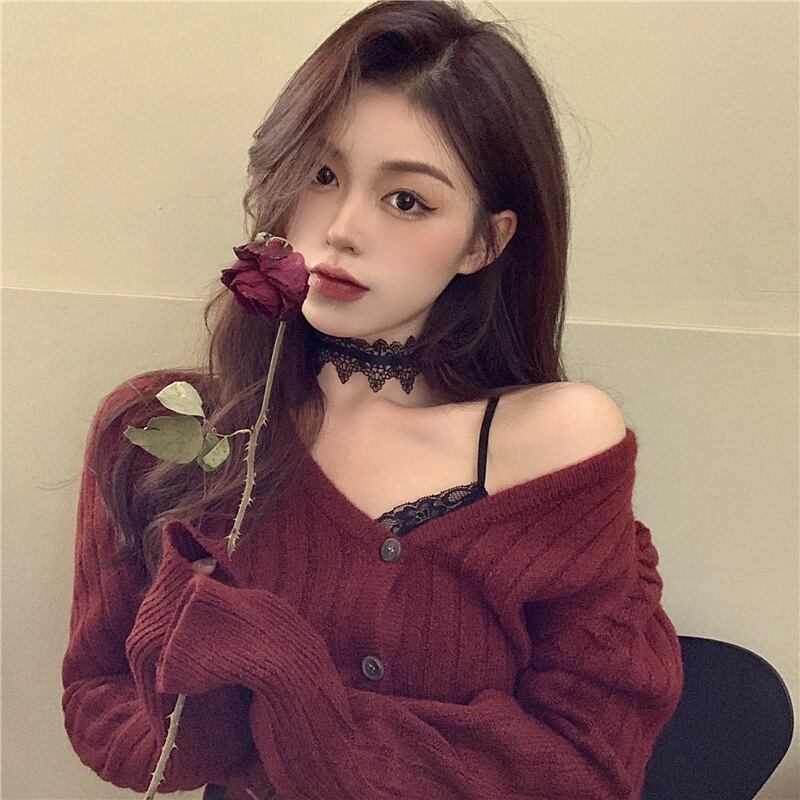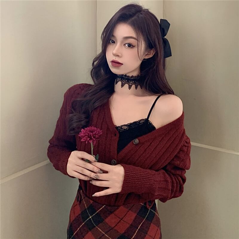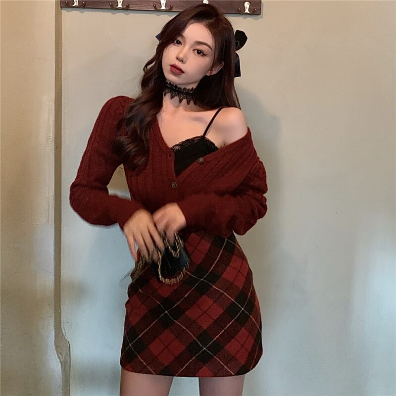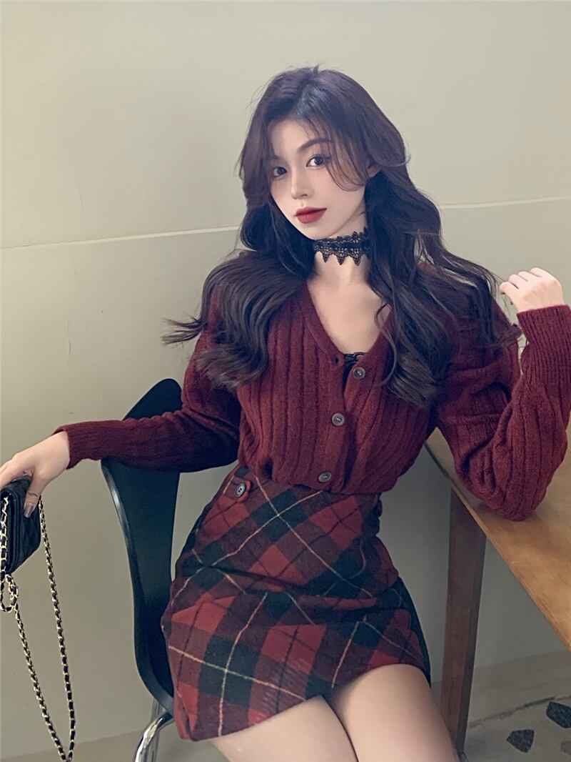 秋物ウィンター韓国ファッションスタイルショートニットレッドセーター カーディガンハイウェストウェスト格子柄スカート レディース オータム 冬物 ウエスト YY81004638717