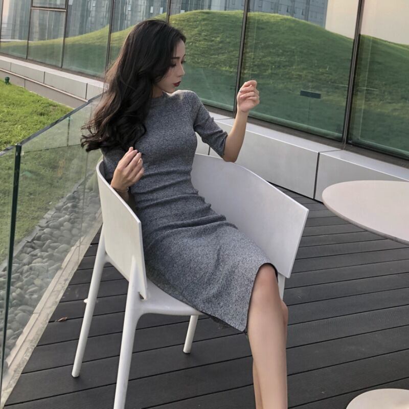 スプリングスリムスカート ラウンドネックニットワンピースレディース 春物 Oネック ミドル丈 ワンナンバー7645336