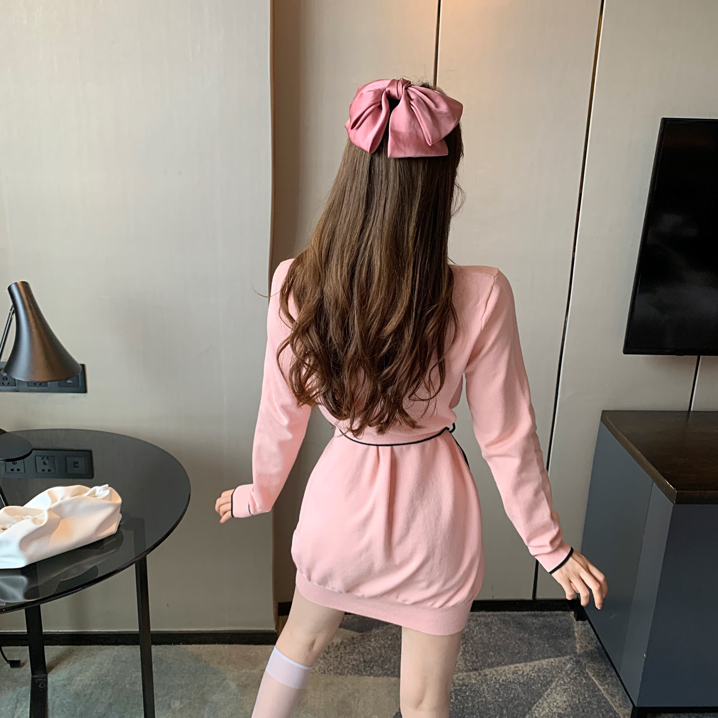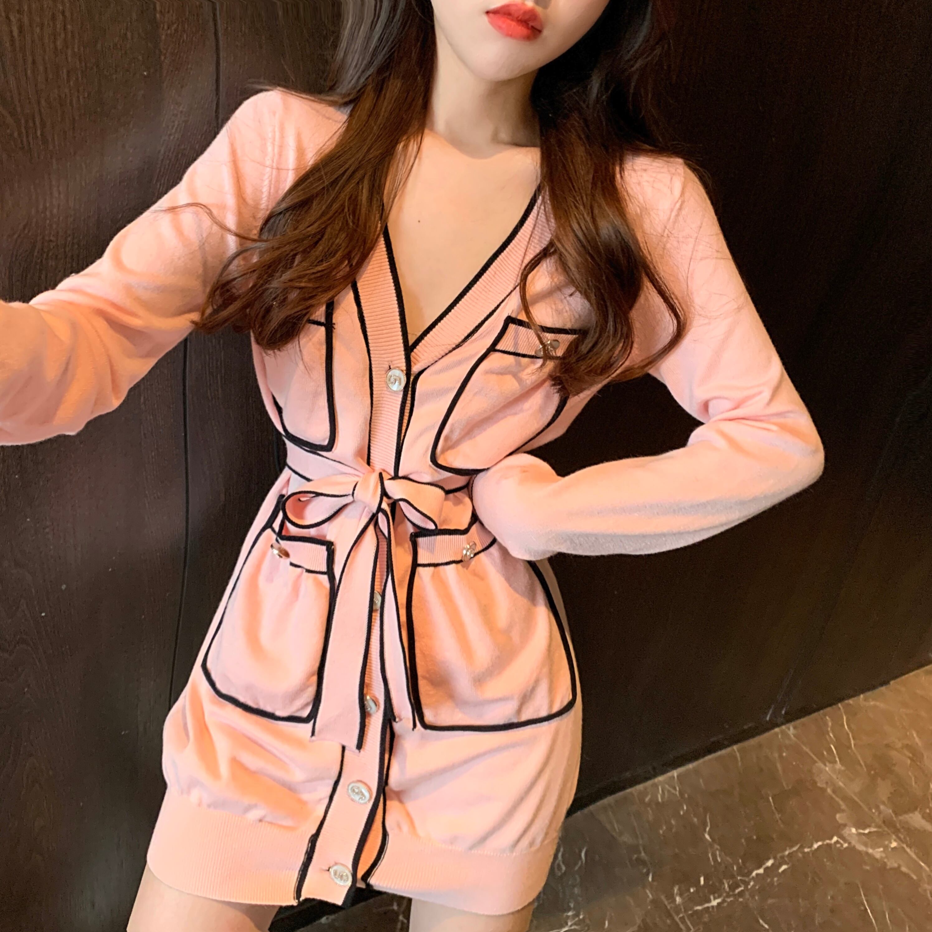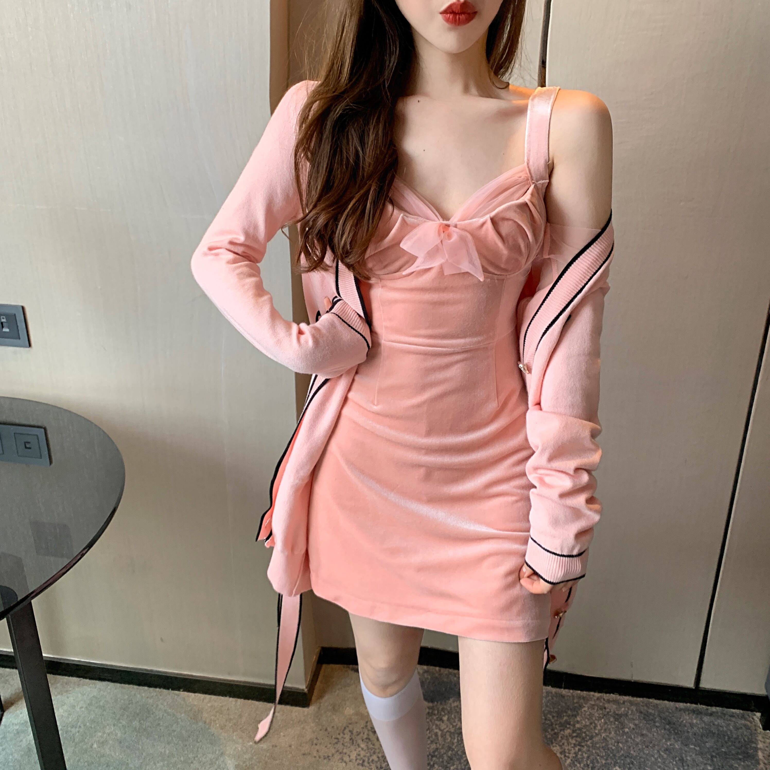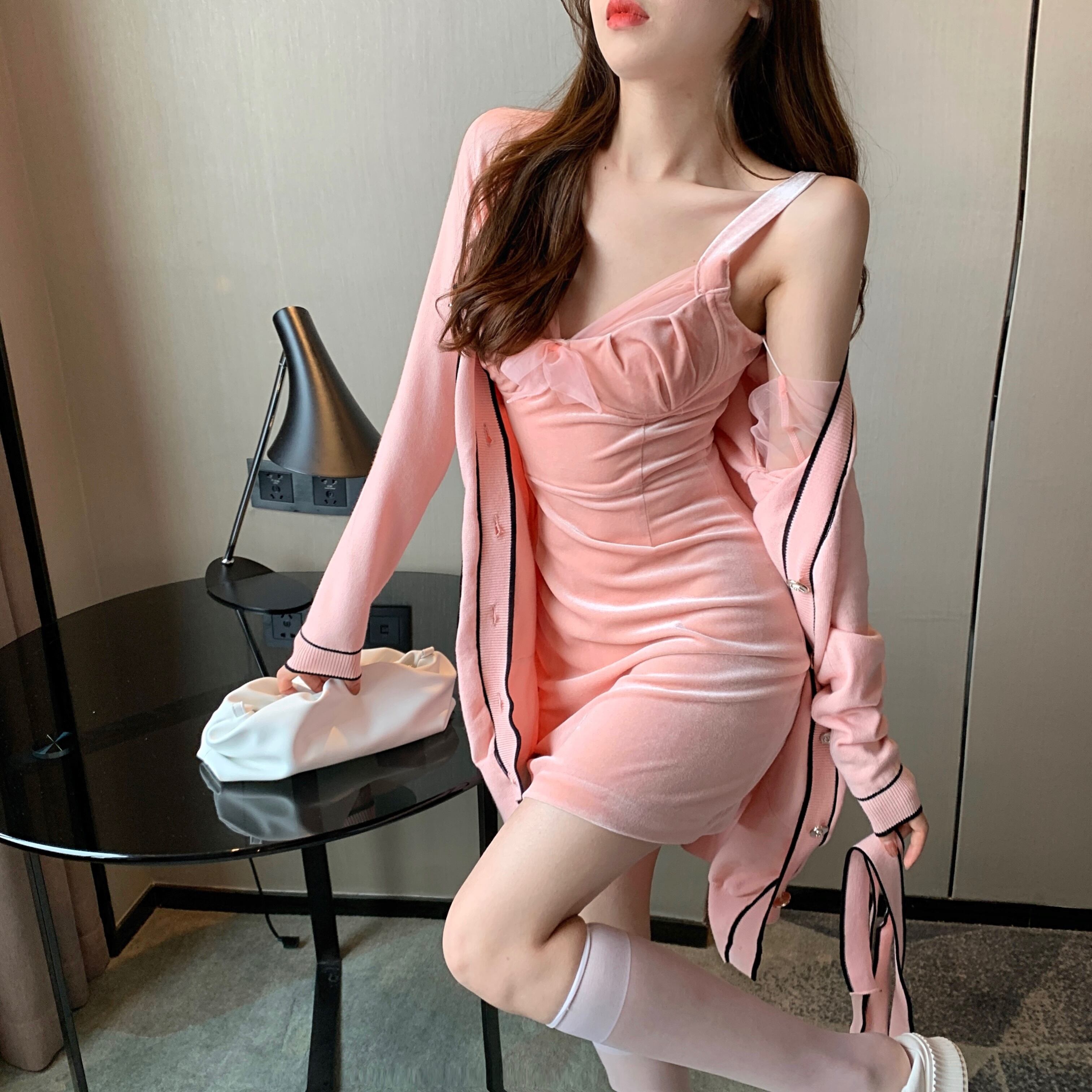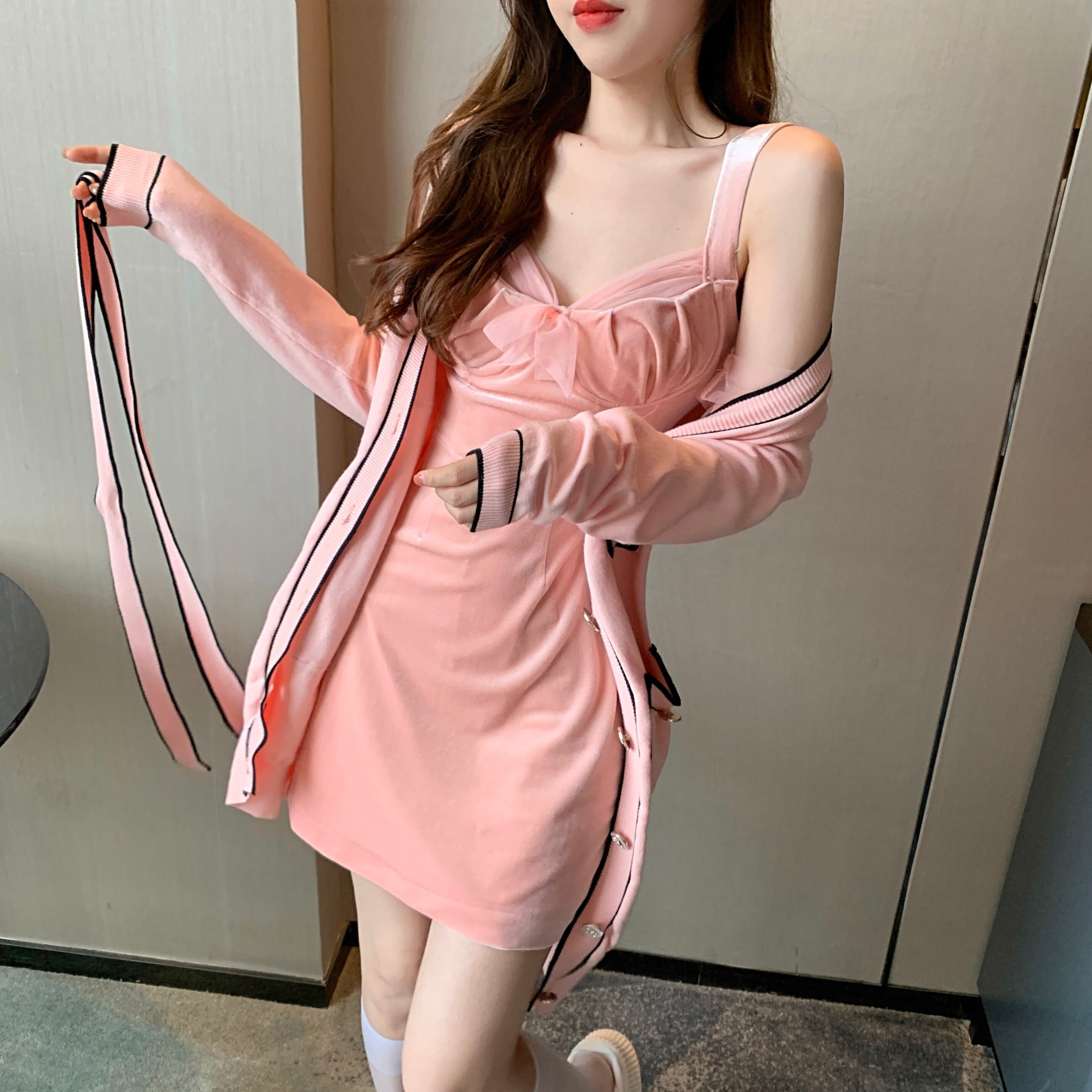 色:さくらピンクニットジャケット,さくらピンクのサスペンダースカート