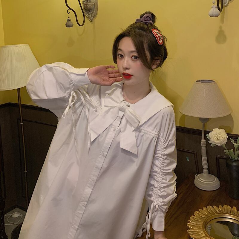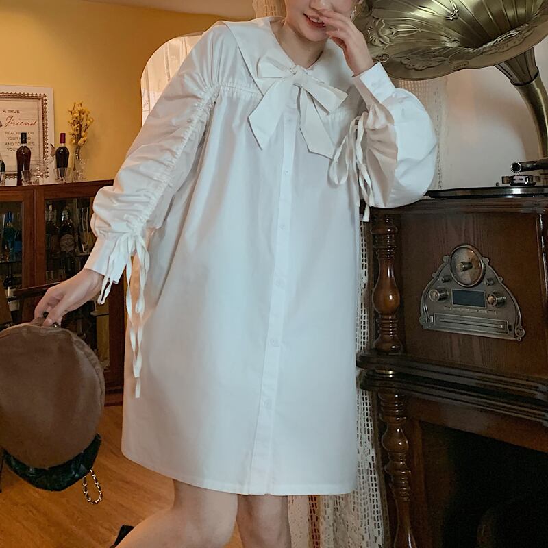 ホワイトシャツ ワンピーススプリング秋物韓国ファッションウェスト薄手Aラインスカート ロング 春物 オータム 長袖 ウエスト ワンナンバー68307293903