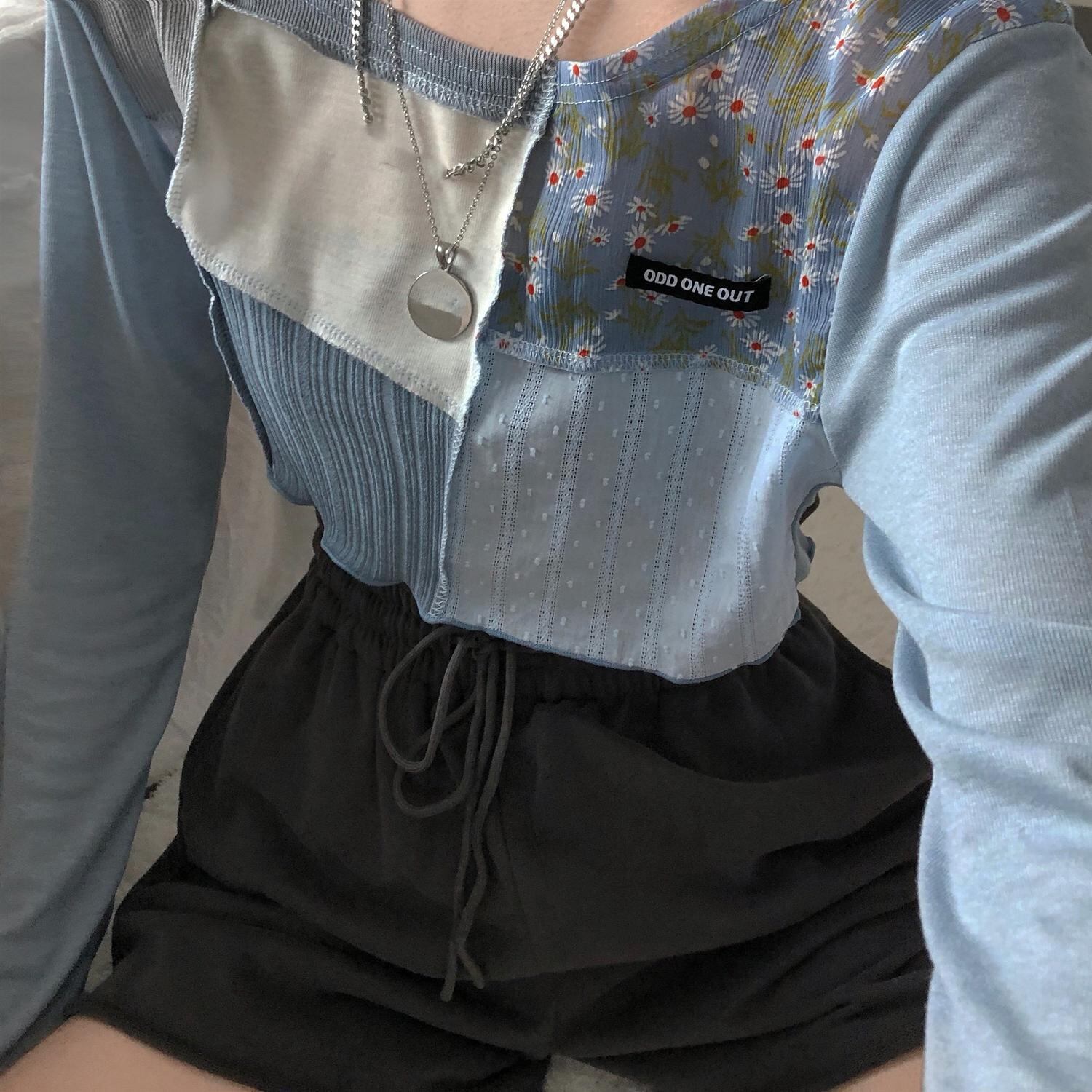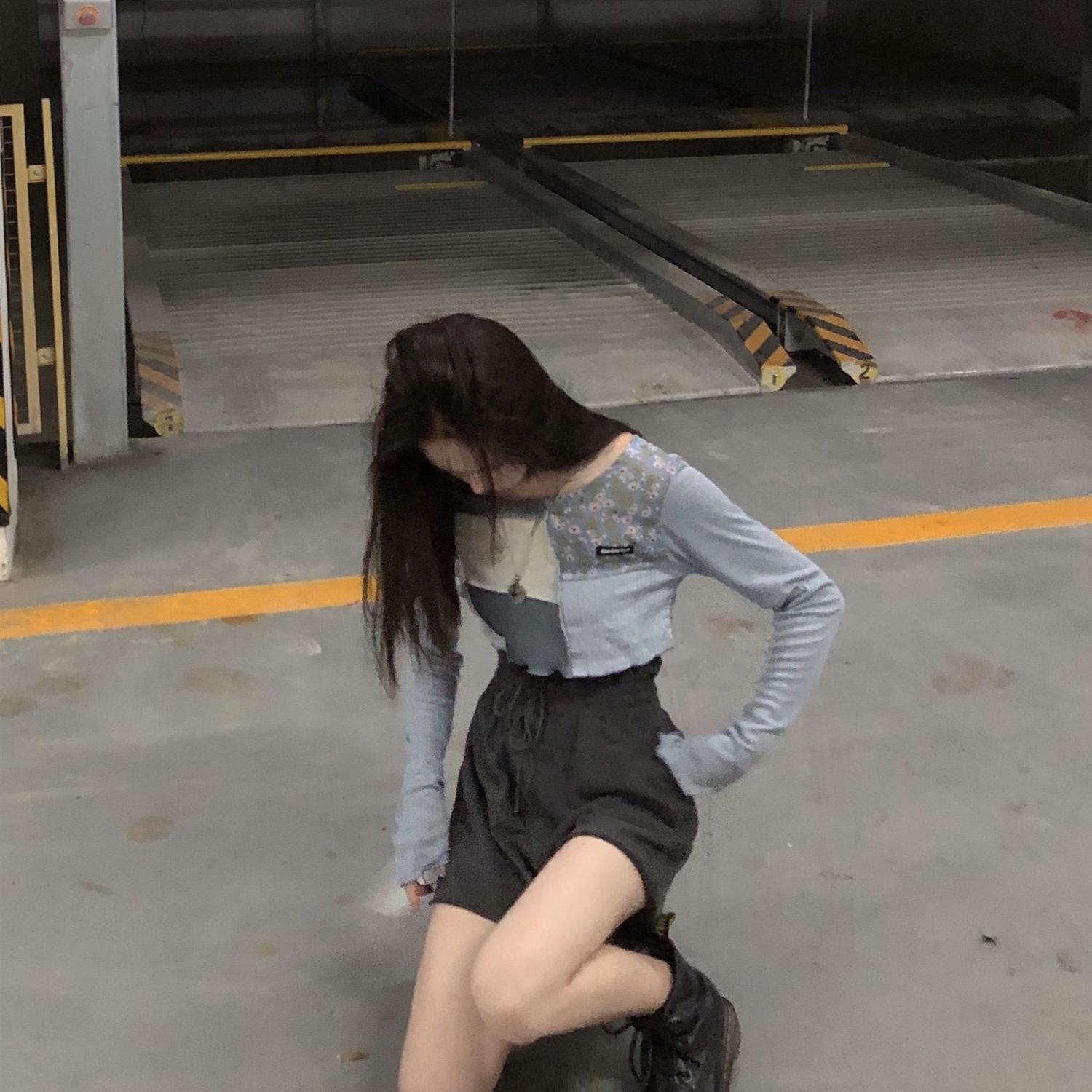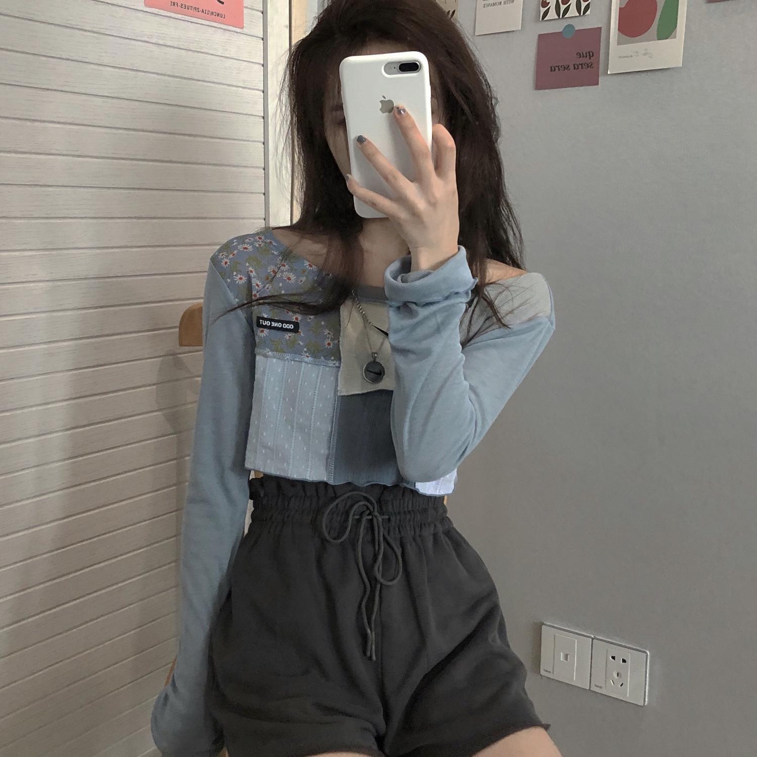 スプリング韓国ファッションスタイルブラウス ハイウェストショーツ 春物 オフショルダー ステッチ ウエスト MONROE42375012715