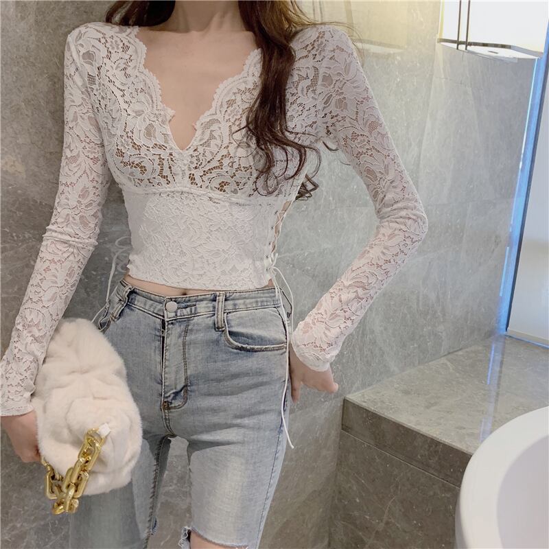 Vネックレースゆったりシャツ スプリングギャザーウェストショートトップス 春物 ウエスト YY40067645811