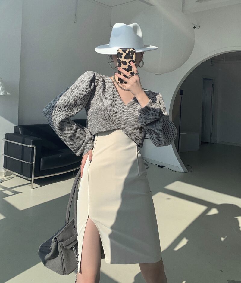 色:ブラックトップ,グレートップ,カーキ色のスカート,白いスカート