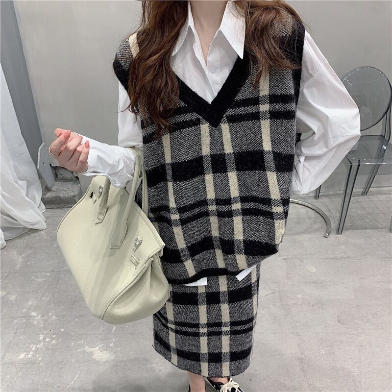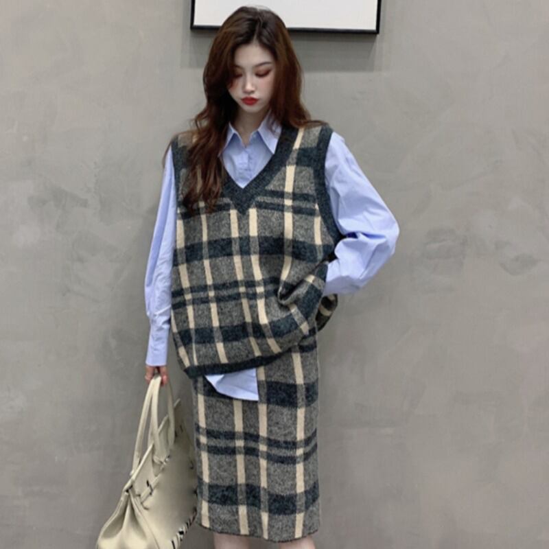 秋物ウィンター韓国ファッションルーズシャツ スタンダードVネック格子柄ストレッチウェストスカート レディース レトロ エラスティック 伸縮 オータム 冬物 スタイル ウエスト ミドル丈 YY38355727671