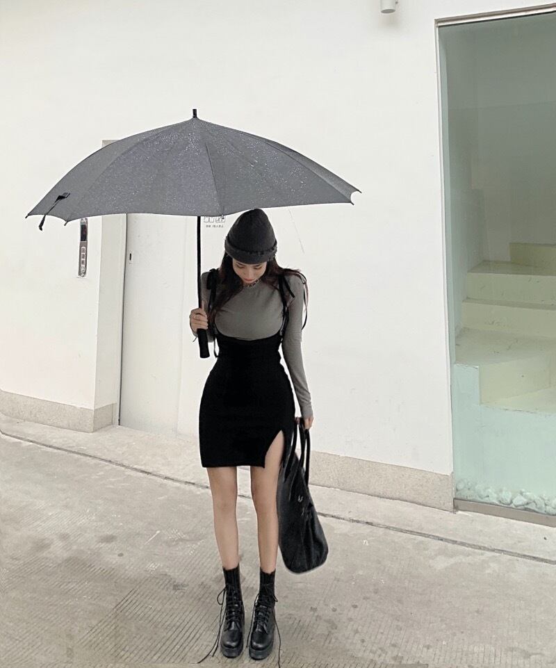 色:グレーのTシャツ,ブラックサスペンダースカート