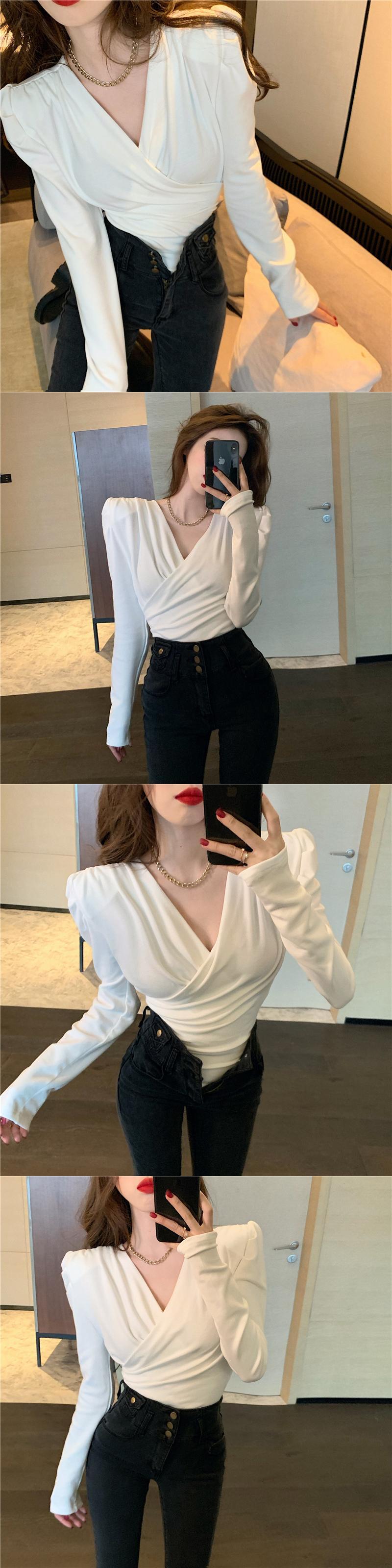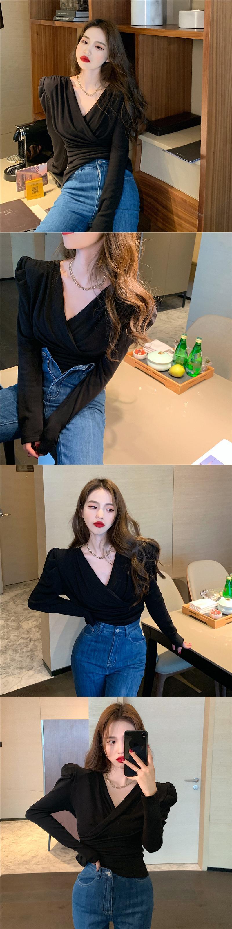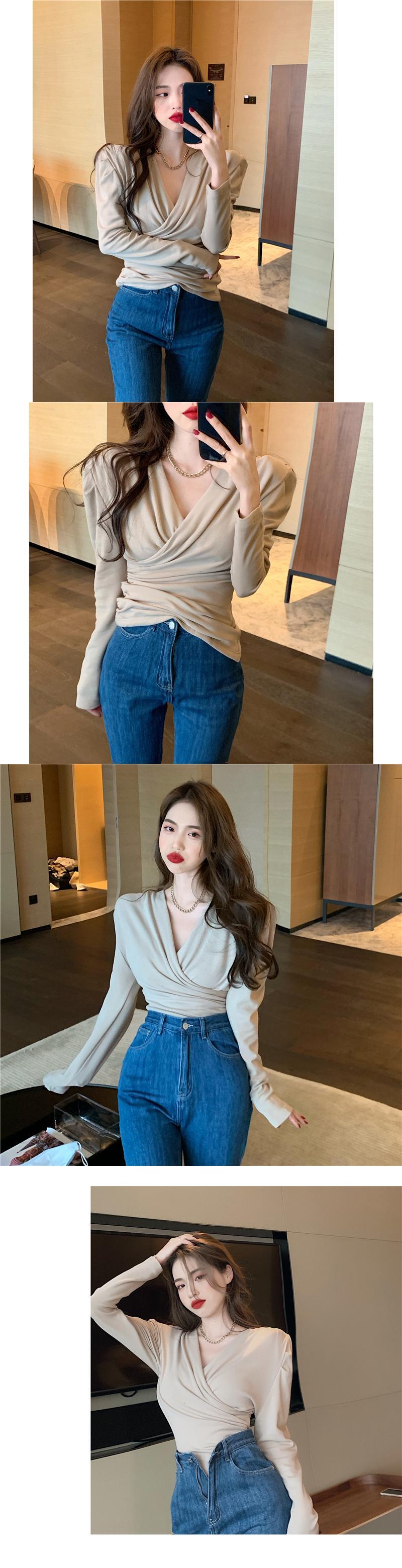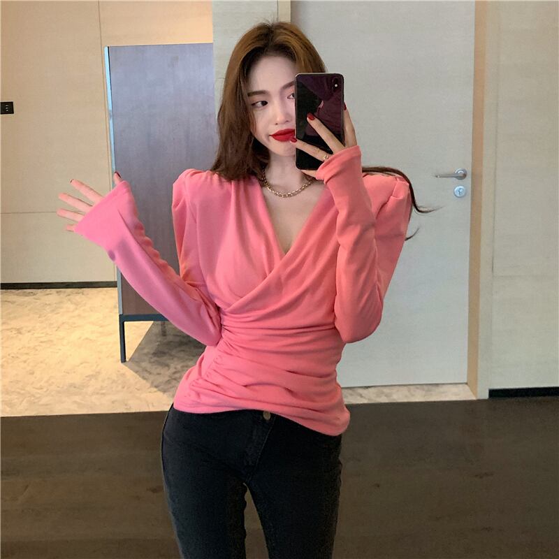 Tシャツシャツ スリムクロスVネックゆったり秋物ウィンタースタイル ロング ピンク コルセット オータム 冬物 長袖 YY64969959156