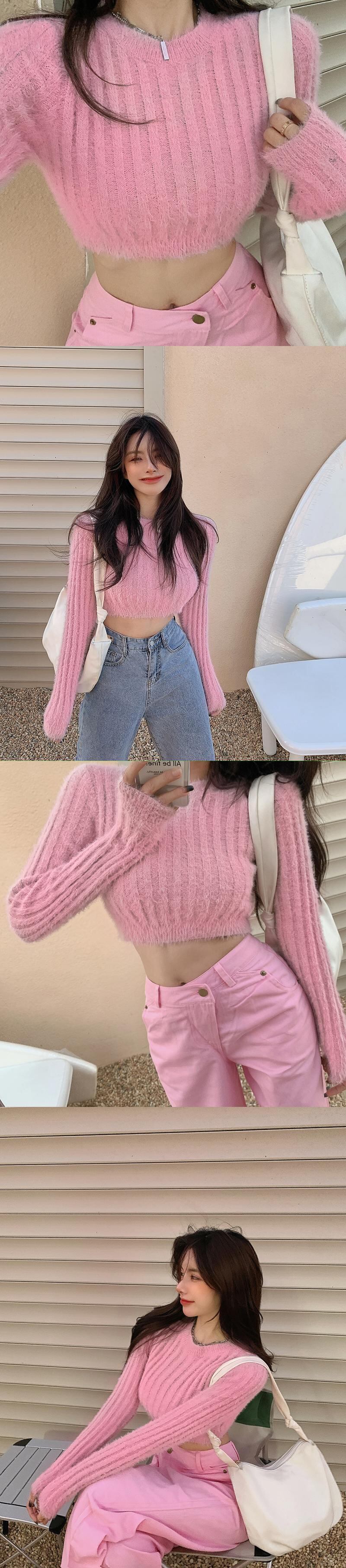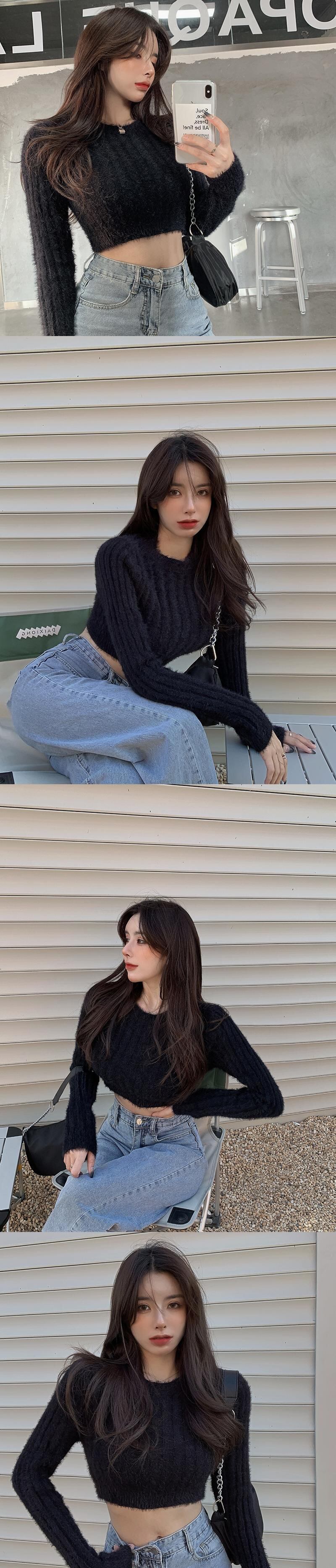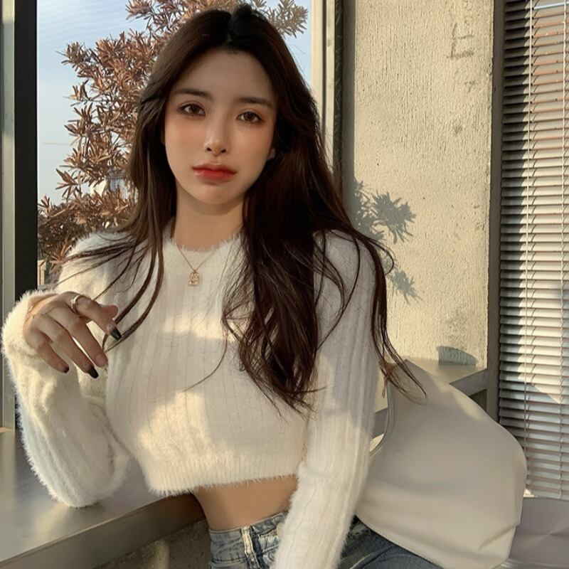 ラウンドネックホワイトショートセーター 秋物ウィンタートップス ロング オータム 冬物 Oネック 長袖 YY11415978308