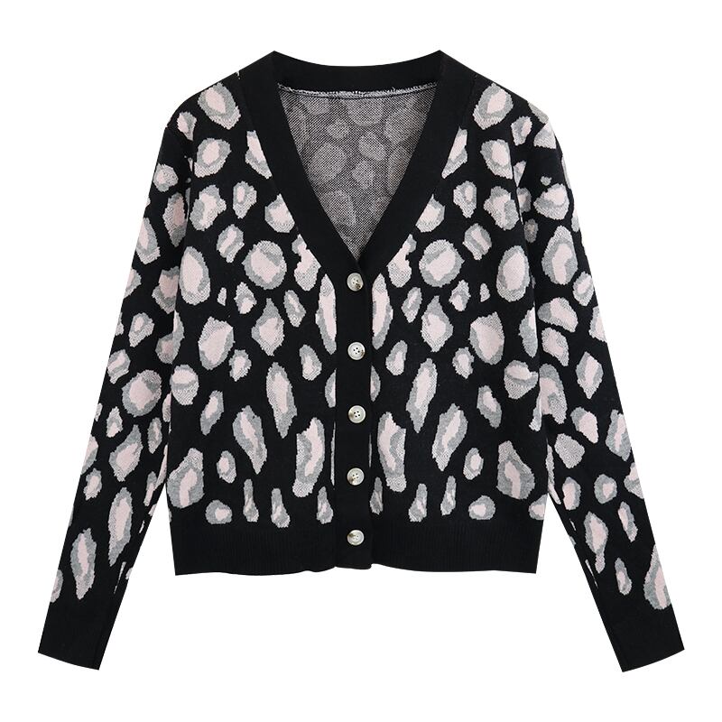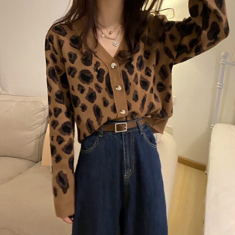 Vネックカーディガンスプリング秋物スタイルシャツ レオパードプリント柄セーター トップス ロング 春物 オータム 長袖 ワンナンバー77298308292