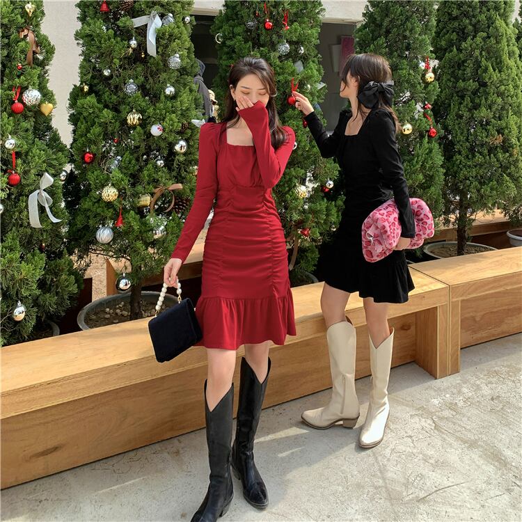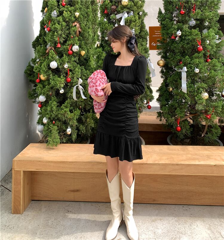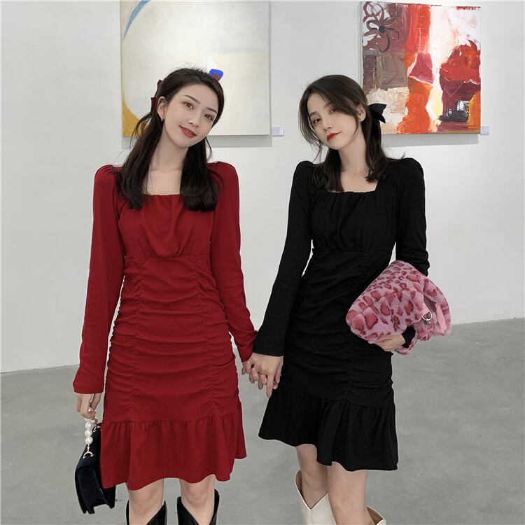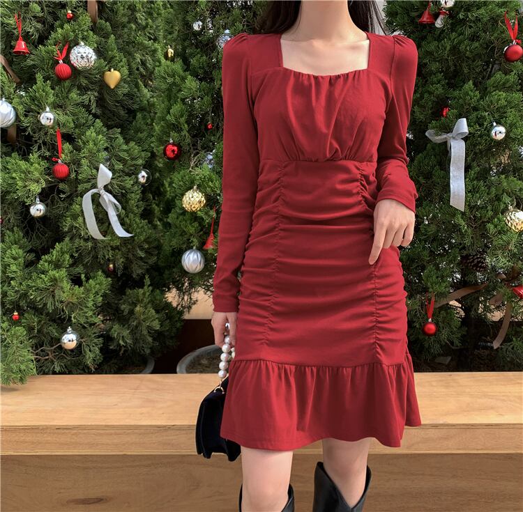 ウェストロングAラインショート秋物ウィンターハイウェストワンピース 長袖 オータム 冬物 スカート スクウェア ウエスト YY4374890281