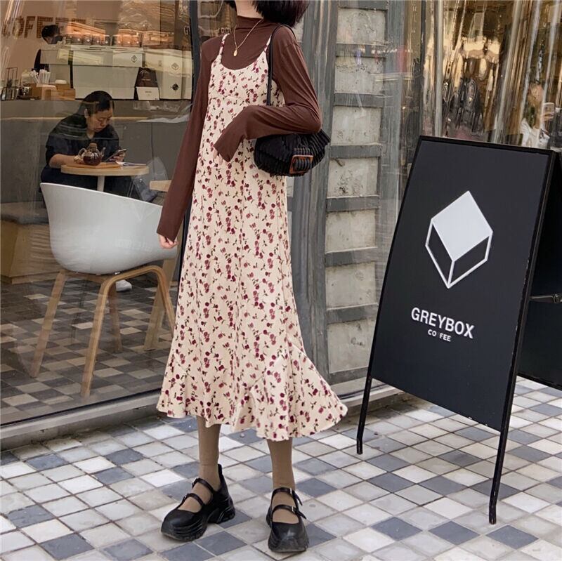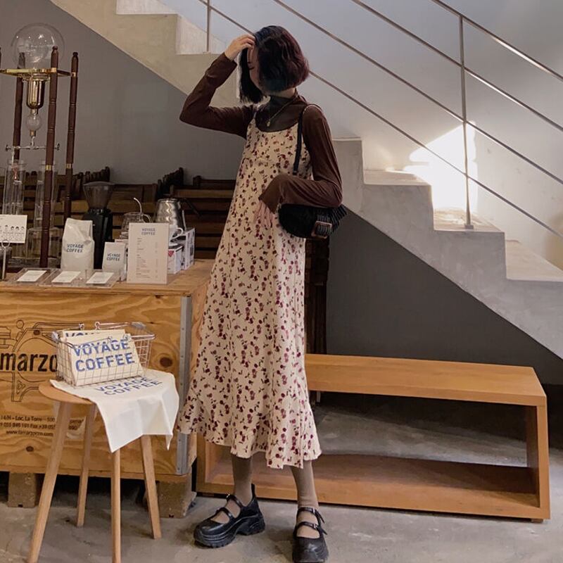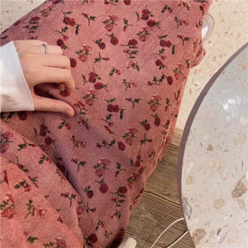 フローラルワンピースレディーススプリング秋物スタイルスタンダードコーデュロイロングスカート レトロ 春物 オータム 花柄 SPM56615520613