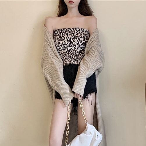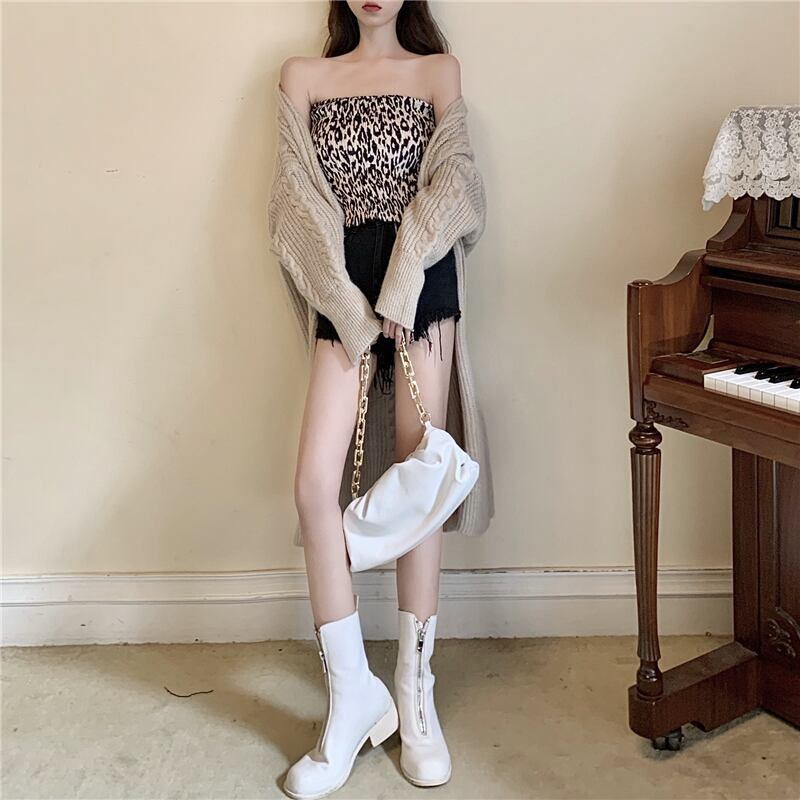 色:ロングセーターコート,ヒョウのチューブトップ,花柄プリーツスカート