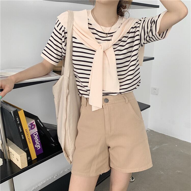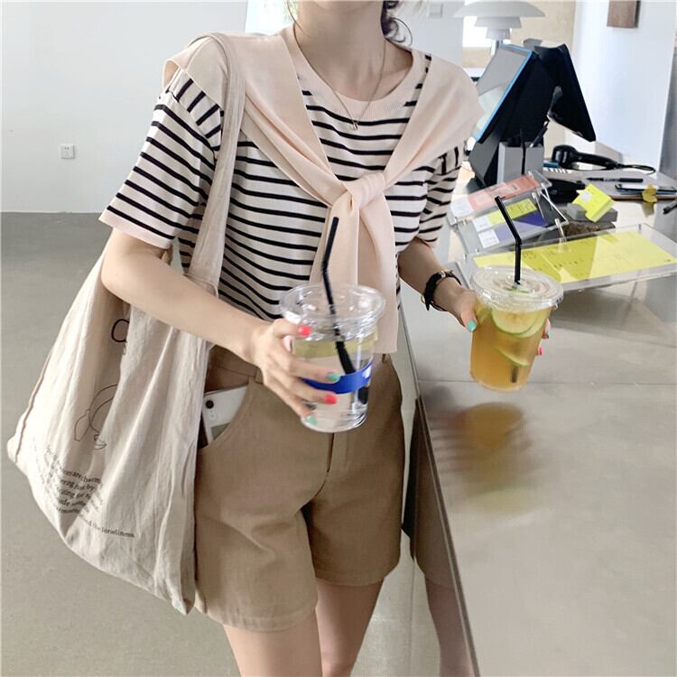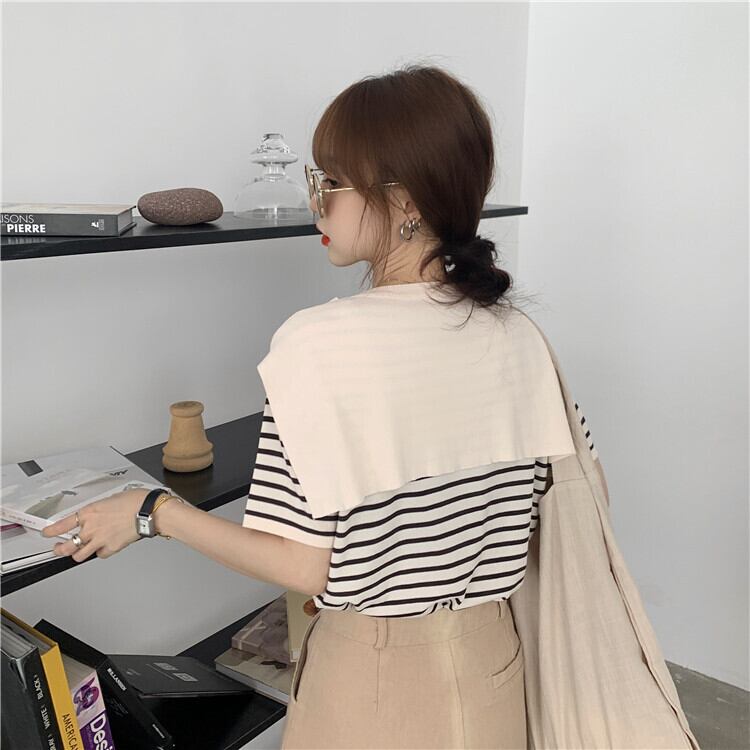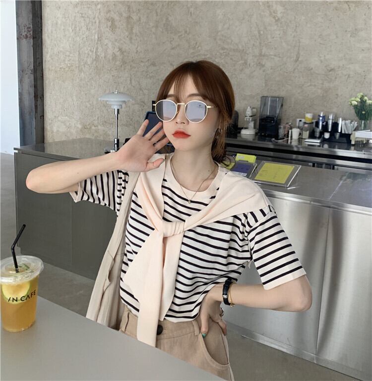 スタンダードストライプニットTシャツスプリング薄手スタイルルーズ レトロ 春物 ワンナンバー55735719984