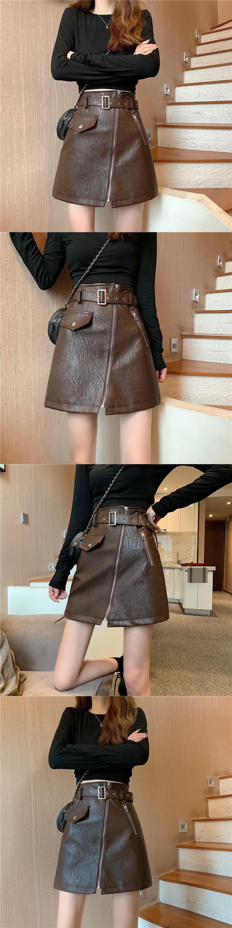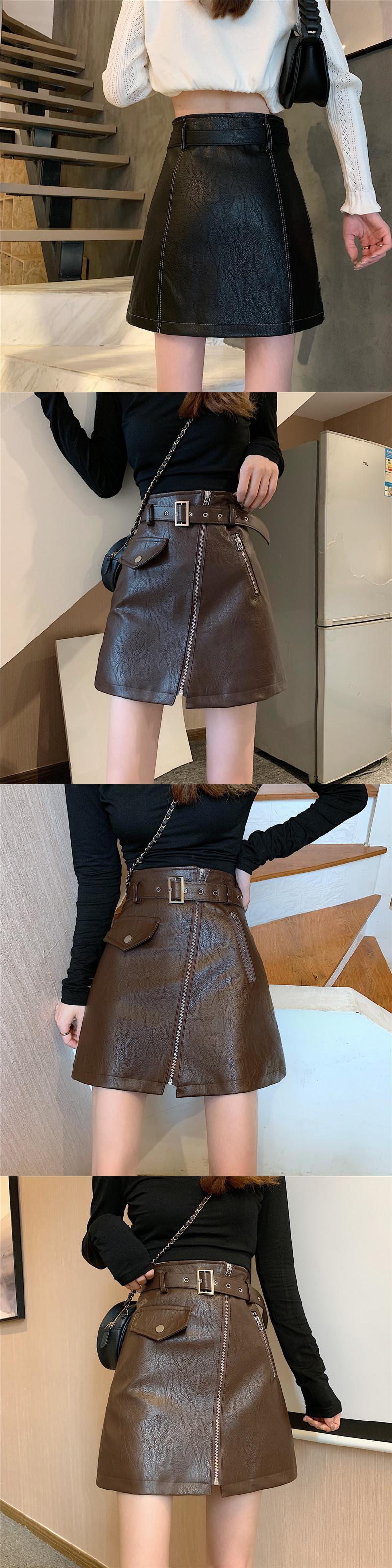 スプリング秋物韓国ファッションレザースカート レディースハイウェストウェストAラインショート薄手ブラック 春物 オータム スタイル ウエスト YY9816192201