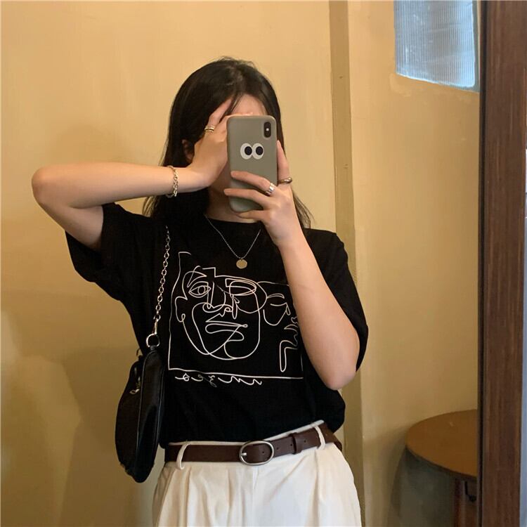 プリント柄Tシャツシャツ レディーストレンドスプリング韓国ファッションルーズブラックゆったりトップス 春物 スタイル SPM69283842986
