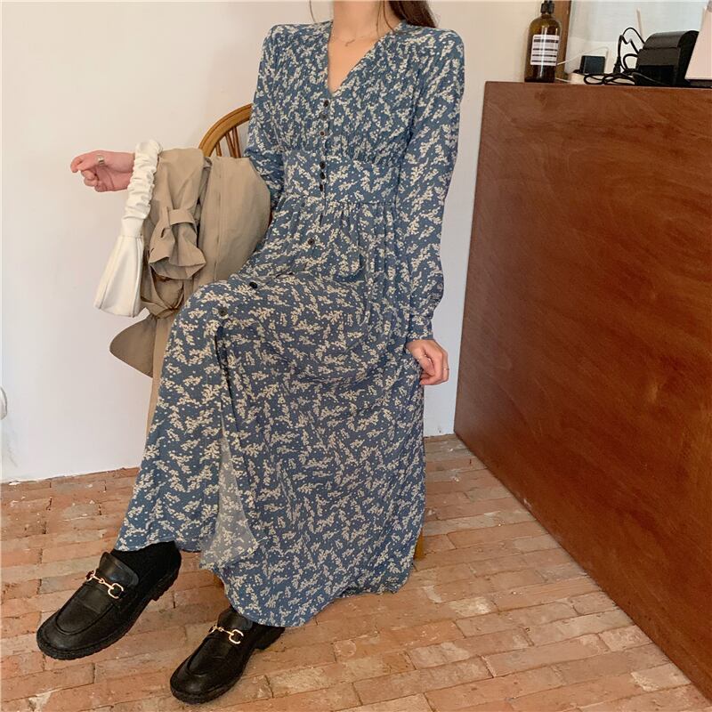 スプリング秋物ウェストワンピースVネックフローラルスカート レディース ロング エレガント 春物 オータム 花柄 長袖 ウエスト YY48193723251