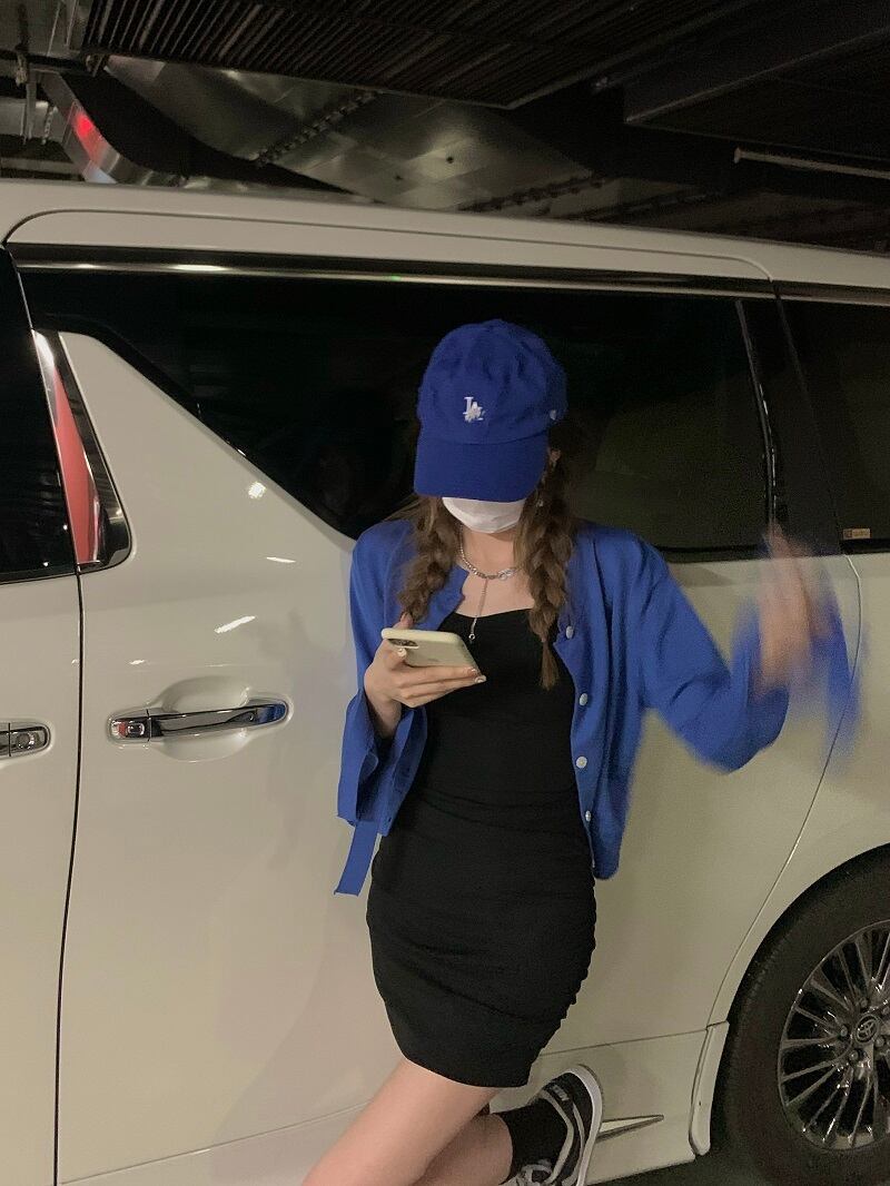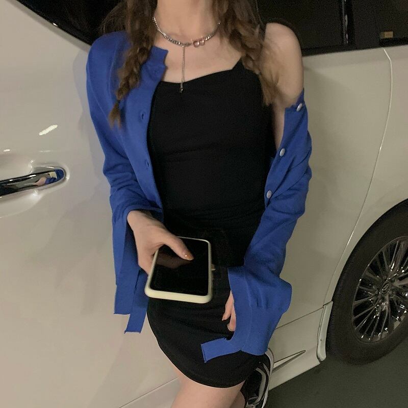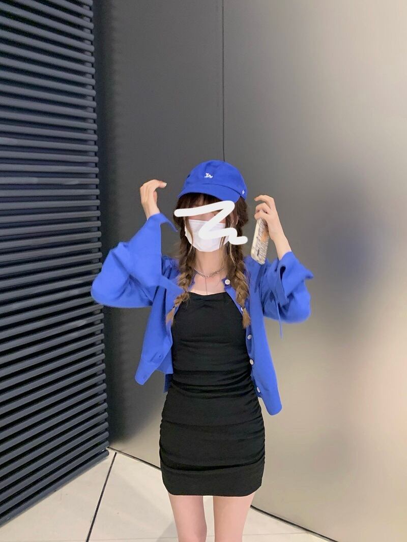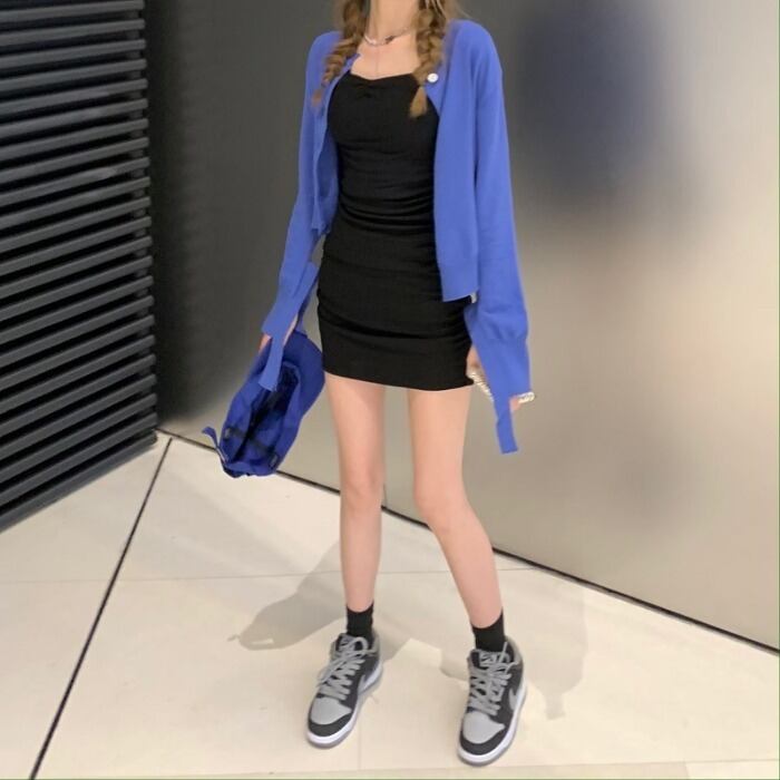色:ブラックサスペンダースカート,ブルーニットカーディガン