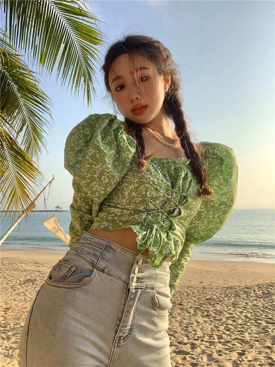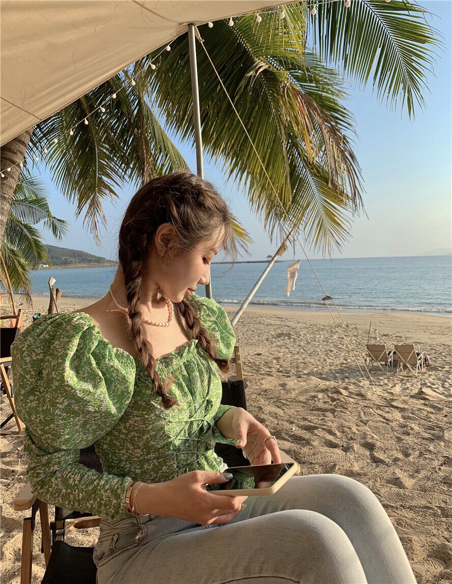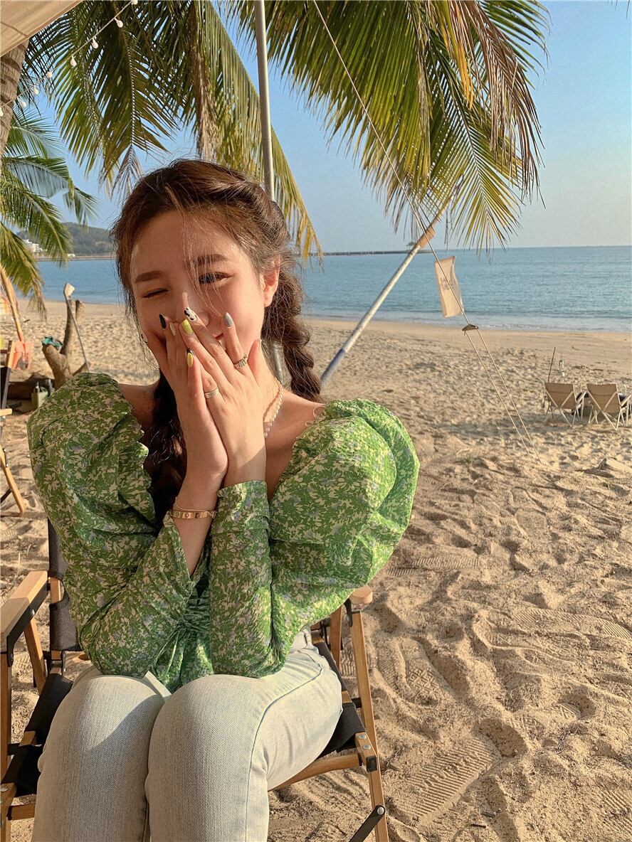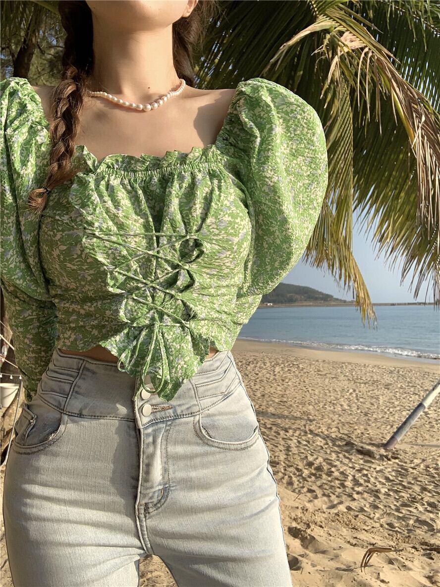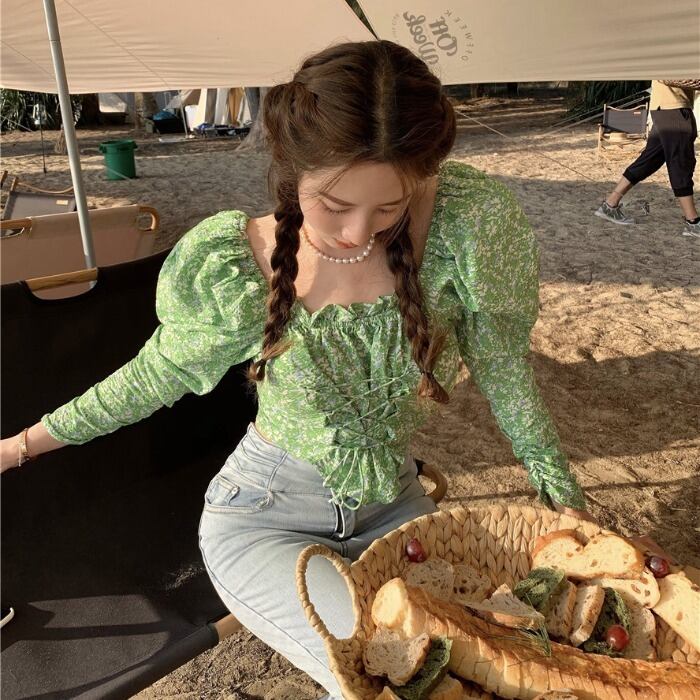 グリーンフローラルシャツ レディースショートトップス 夏服スタンダード ロング レトロ 夏物 花柄 長袖 MONROE39349896509