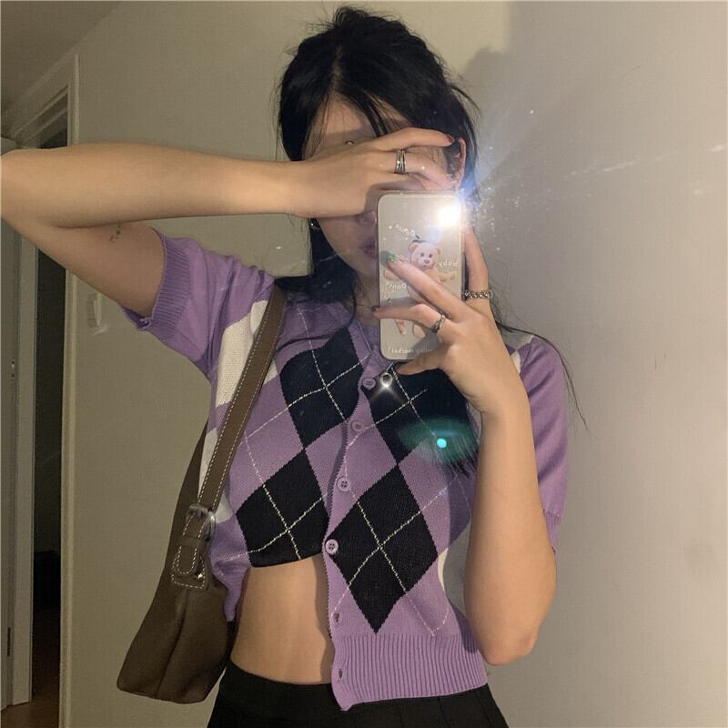 スタンダード格子柄セーター レディースルーズショートカーディガンジャケット 夏服コート レトロ 夏物 MONROE77414930596