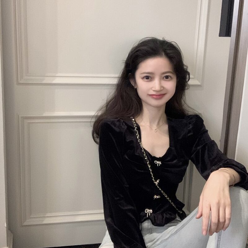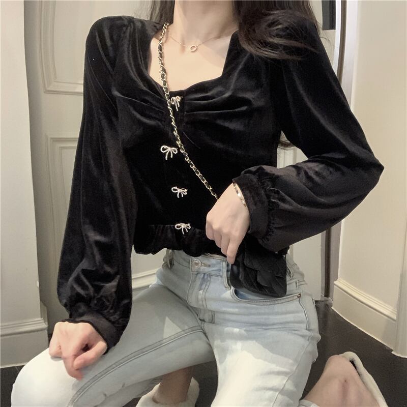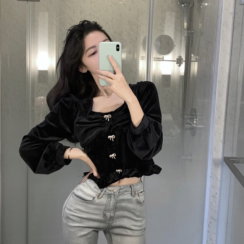 ブラック厚みスリーブシャツ レディーススプリング韓国ファッションリボンショートトップス ロング 春物 長袖 SPM45838185484
