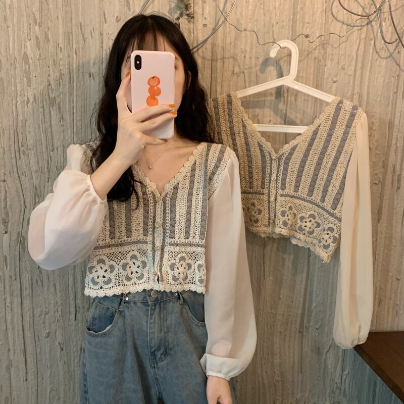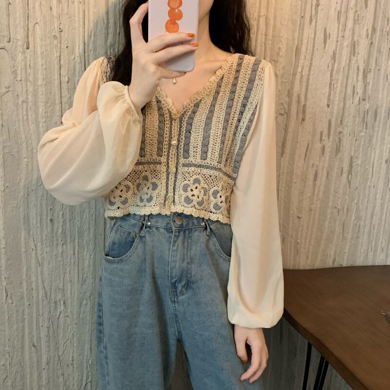 スプリング韓国ファッションスタンダードVネックショートトップス ルーズレースシャツ レディース ロング レトロ 春物 長袖 SPM26648991669