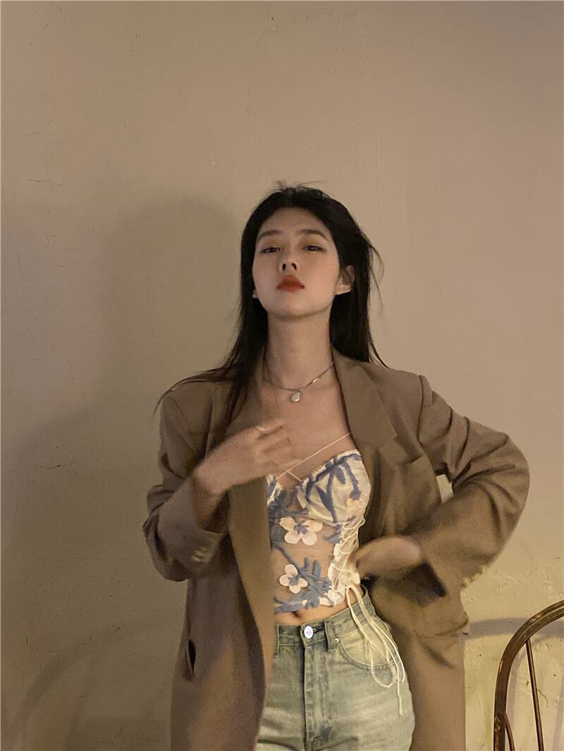スプリングレース刺繍ストラップ ギャザー薄手ノースリーブトップス 春物 SPM69121638952