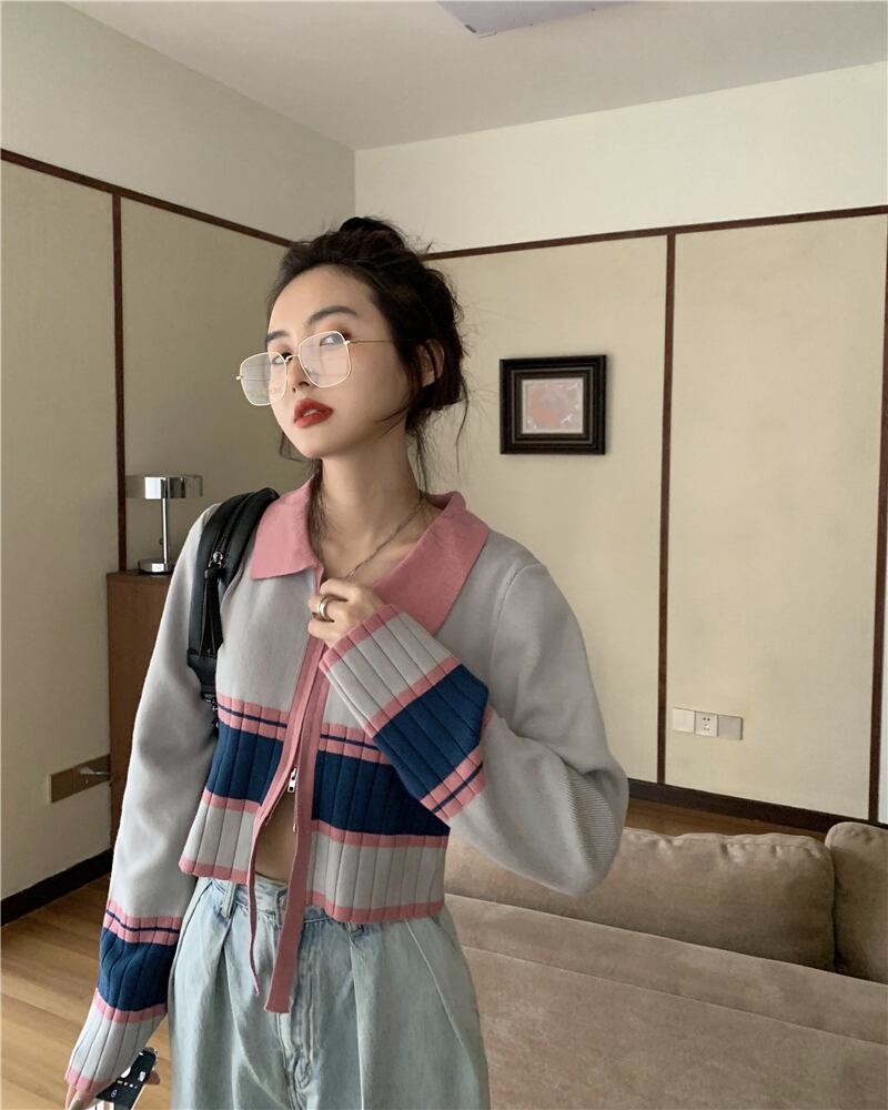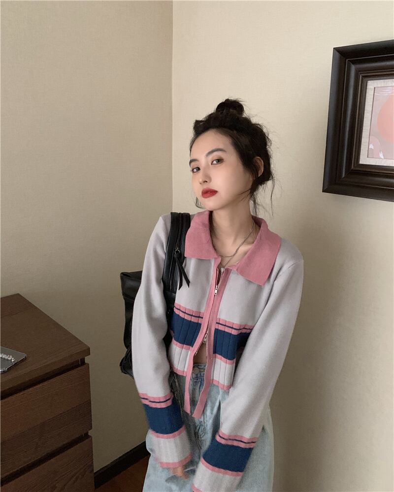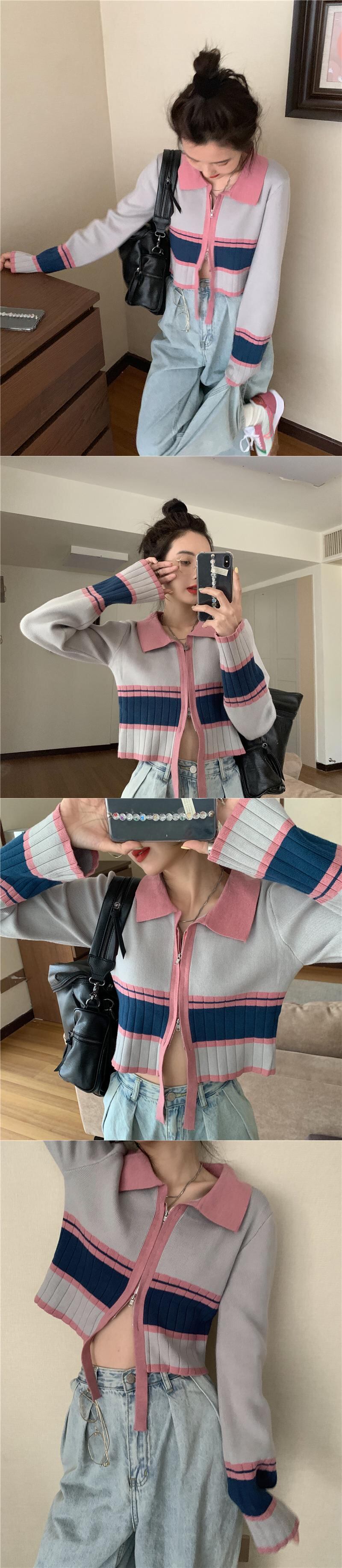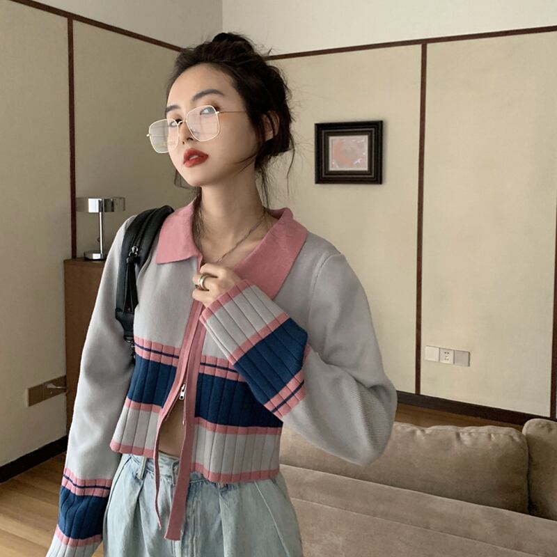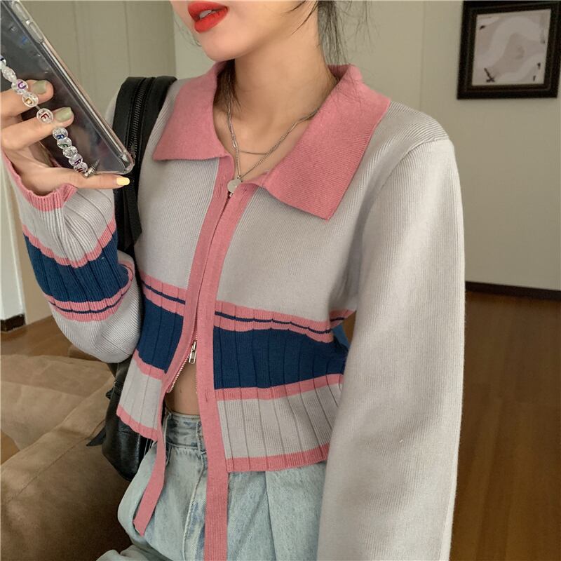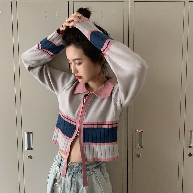 ダブルジッパーカラーセーター スプリングスタイルショートゆったりシャツ トップス 春物 SPM23184615948
