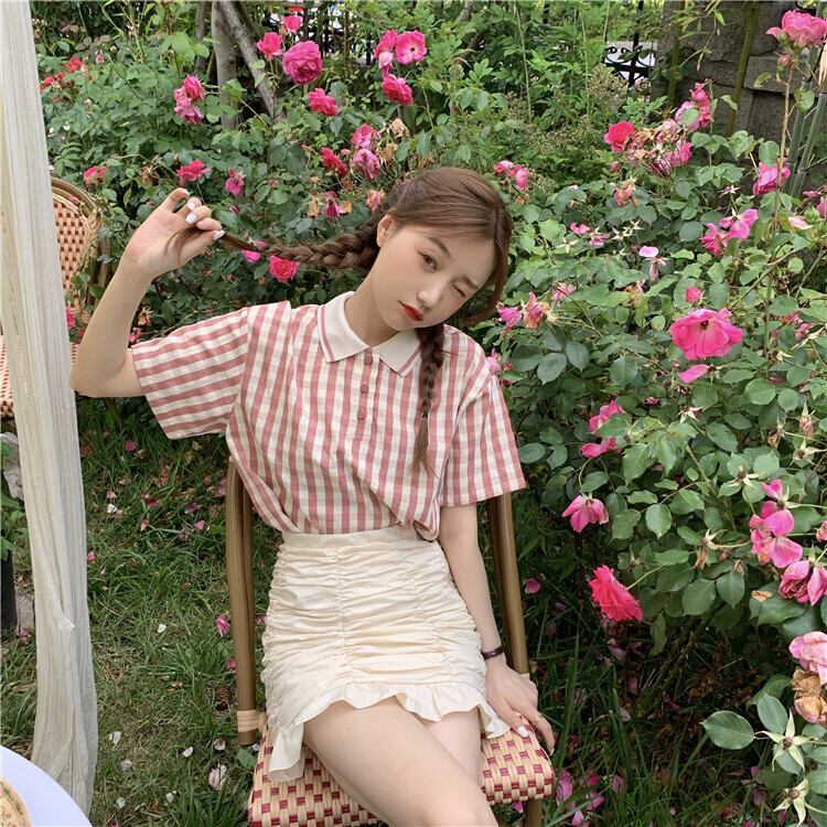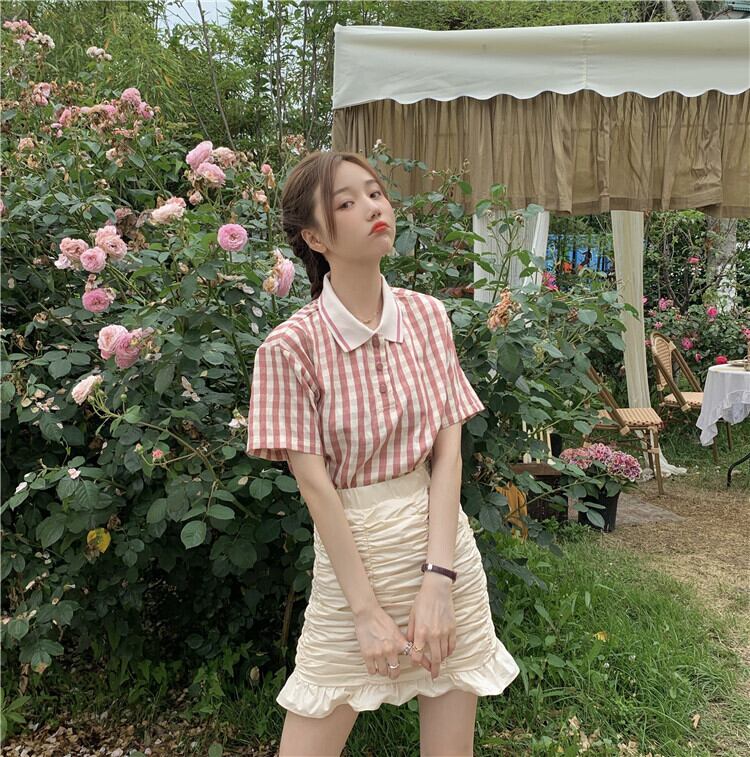 格子柄カラーTシャツレディーススプリング韓国ファッションスタイルルーズゆったりトップス ピンク 春物 SPM34986581232