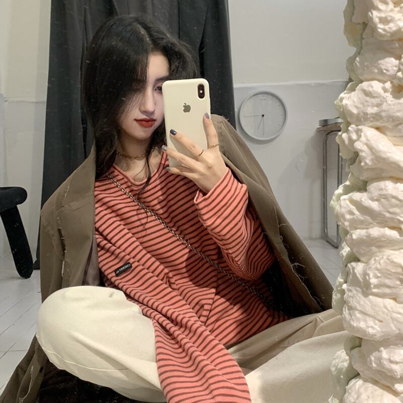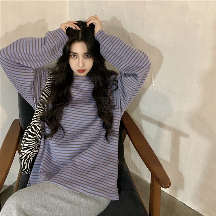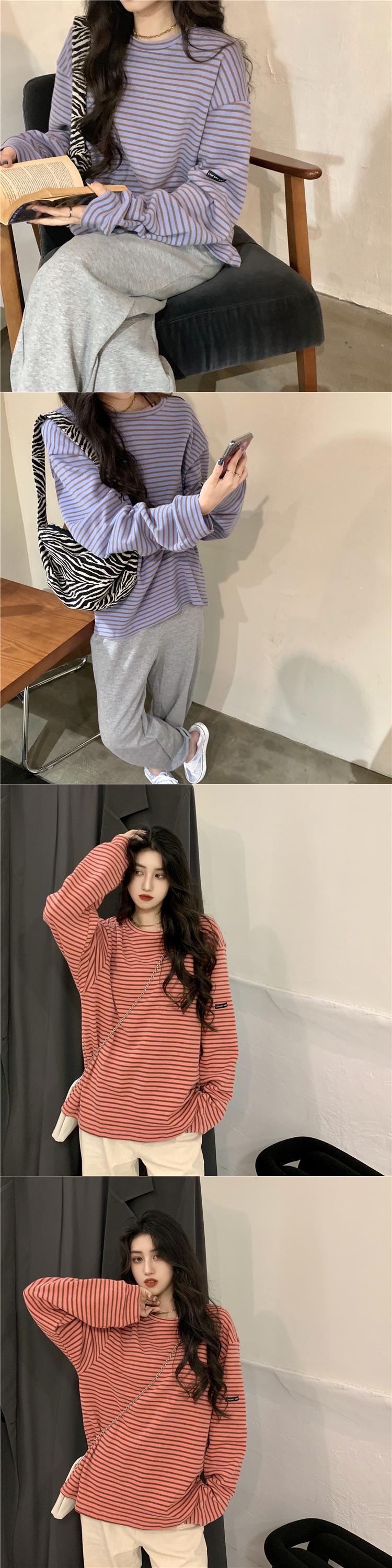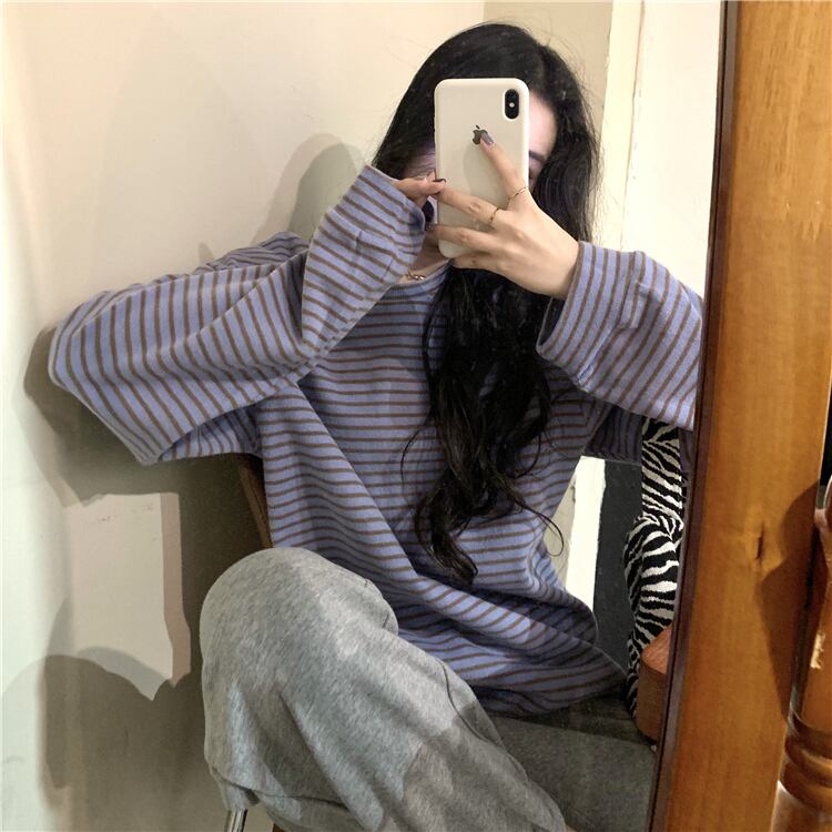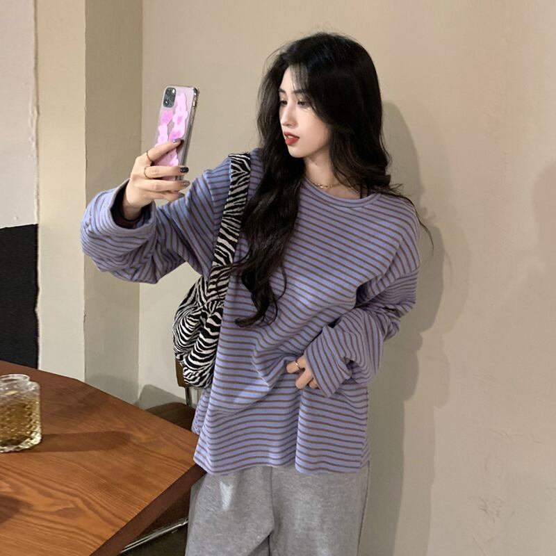 ストライプTシャツシャツ スプリング秋物韓国ファッションルーズゆったり薄手トップス ロング コットン 春物 オータム パープル スタイル 長袖 SPM33607963847