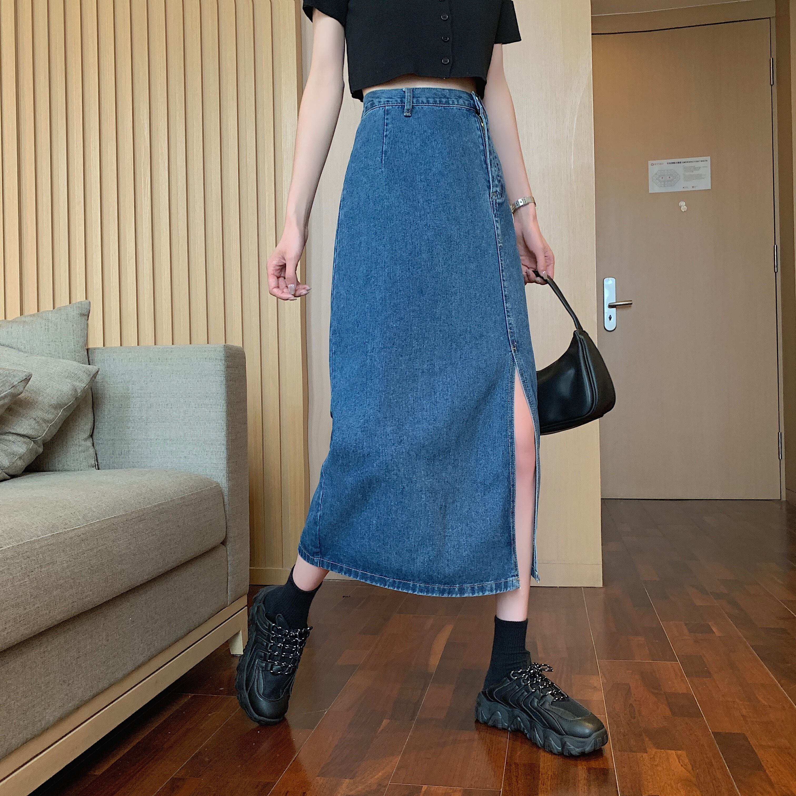 スタンダードダークブルースカート レディーススプリングハイウェストウェストAライン レトロ 春物 ウエスト ミドル丈 SPM2456862657