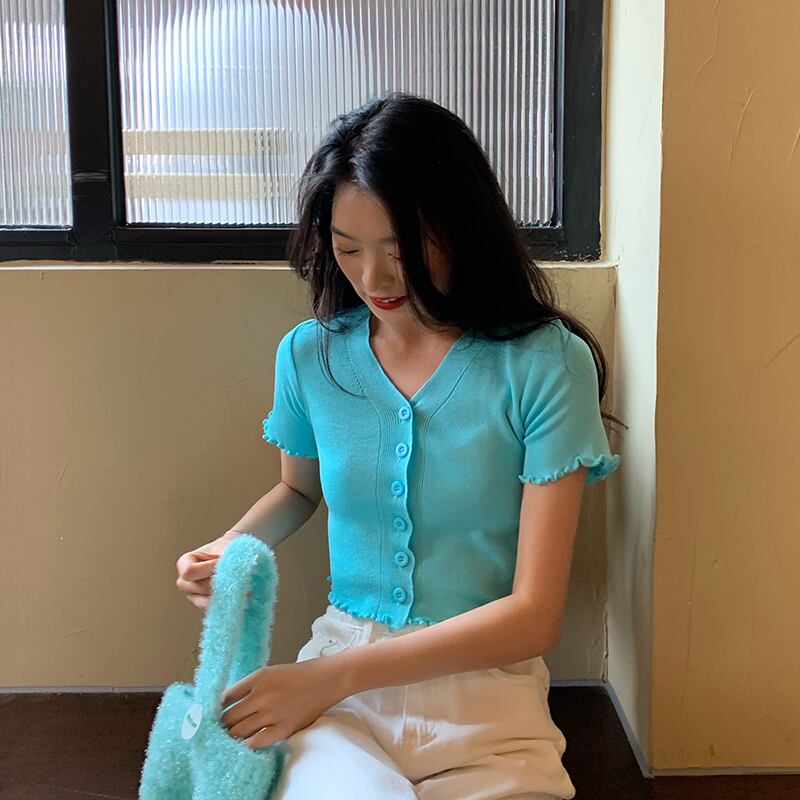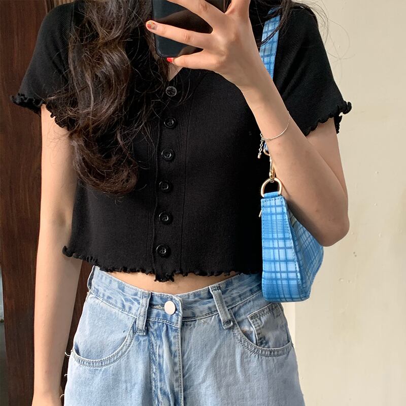 スタイルVネックショートニットカーディガントップス スプリング韓国ファッションブラックTシャツレディース 春物 SPM52134300210