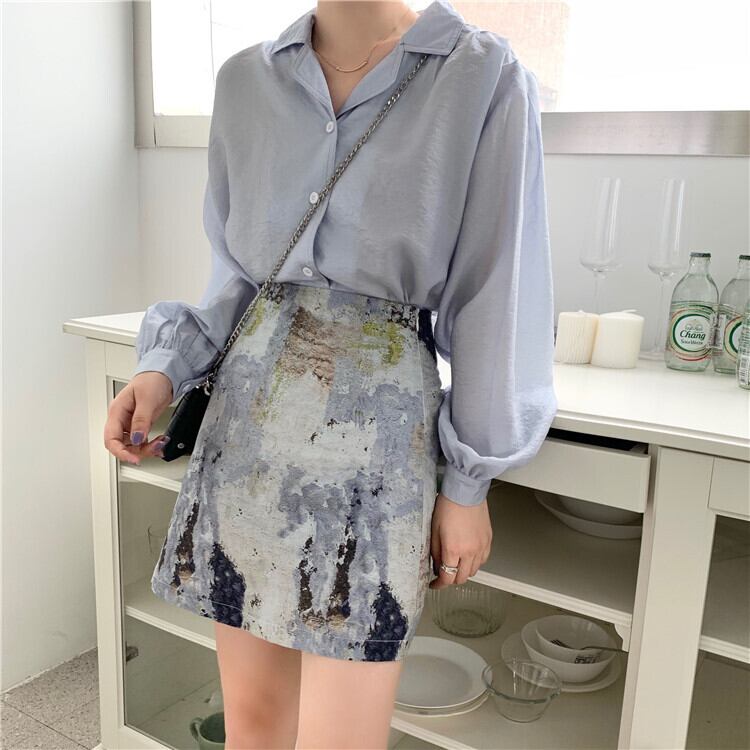 色:ライトブルーのシャツワンピース,油絵スカートワンピース